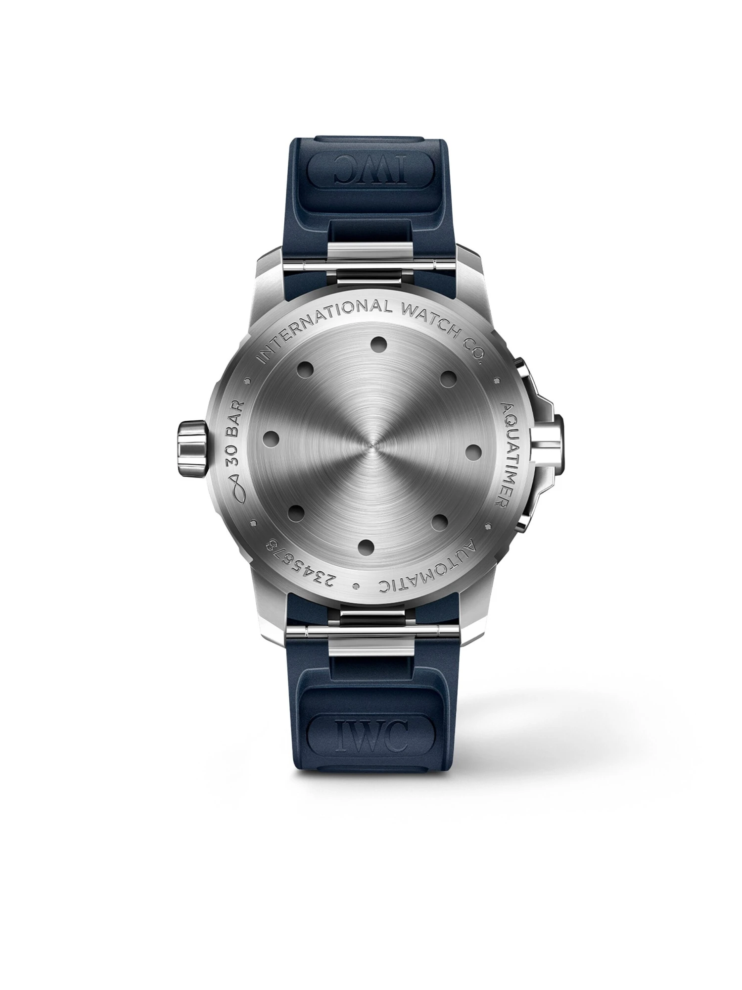 The Aquatimer Automatic IW328801 from IWC Schaffhausen introduces a new standard size: Measuring 42 millimeters in diameter and 14.1 millimeters in height, it is the smallest model in the family. With the quarter-hour scale on the internal rotating bezel, it reflects the look of the first Aquatimer from 1967. The beveled shape of the slim external bezel with its rounded recessed grips, on the other hand, is inspired by the legendary Porsche design of the Ocean 2000 from 1982. All diving-related indications on the black dial feature a luminescent coating. The external/internal rotating bezel with SafeDive system combines ease of use and safety. Inside the stainless-steel case, which is water-resistant to 30 bar, there is in-house IWC caliber 32111. The sporty timepiece is fitted on a blue rubber strap.