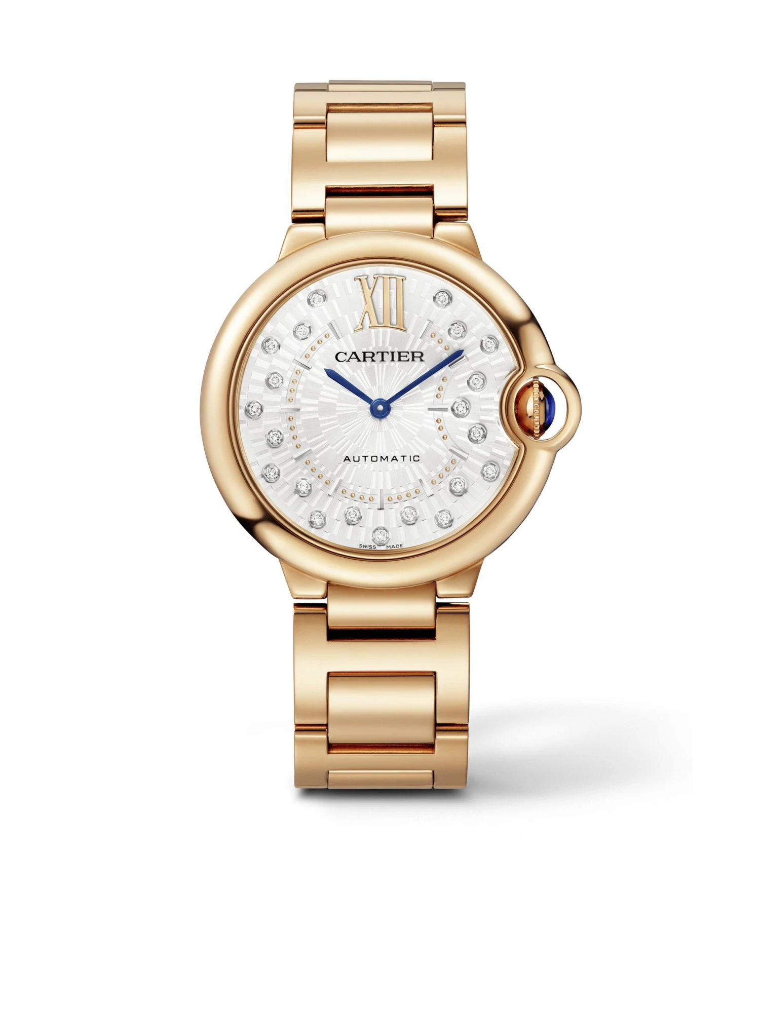 Ballon Bleu de Cartier watch, 36 mm. Self-winding mechanical movement. Rose gold 750/1000 case and fluted crown in rose gold 750/1000 set with a sapphire cabochon. Matt silvered stamped sunray dial set with 21 brilliant-cut diamonds totaling 0.19 carats. Blued-steel sword-shaped hands. Sapphire crystal. Interchangeable bracelet in rose gold 750/1000. Thickness: 0.47”. Water-resistant up to 3 bar (approx. 30 meters/100 feet).