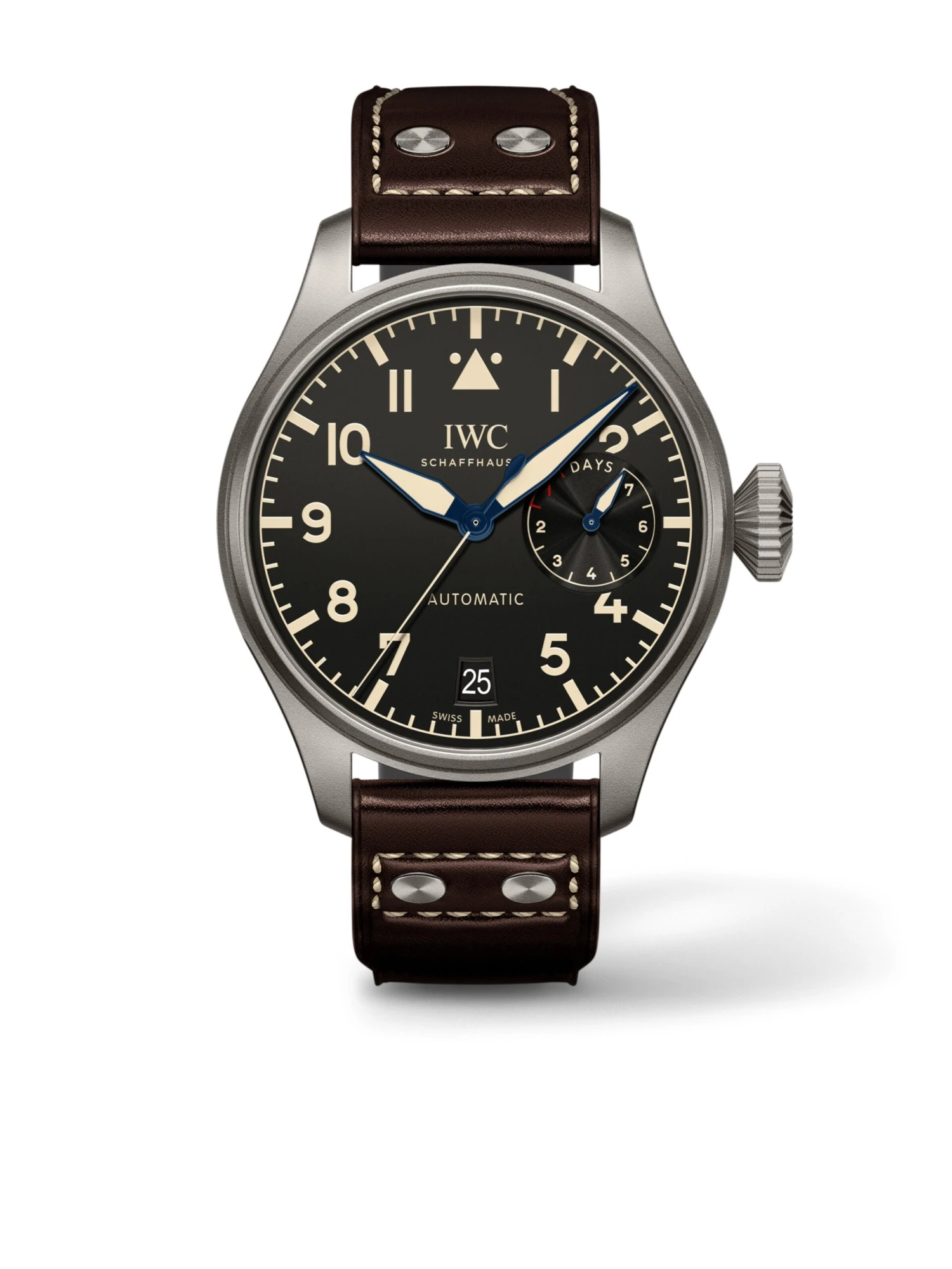 It’s all in the name here: Measuring a proud 46.2 millimeters in diameter, the Big Pilot’s Watch Heritage Ref. IW501004 brings the technical charm of historical observation watches to the wearer’s wrist. Since the 15.4 millimeter high case is made of titanium, however, it is only light in terms of its weight. On the inside, it features the caliber 52110, a true powerhouse: The movement, which is protected against magnetic fields, runs for seven days. The power reserve indicator at three o’clock indicates how long the energy will last. The brown calfskin strap accentuates the vintage character of the watch, which is a stylistic reference to the “Large Aviator Watch Caliber 52 T.S.C”.