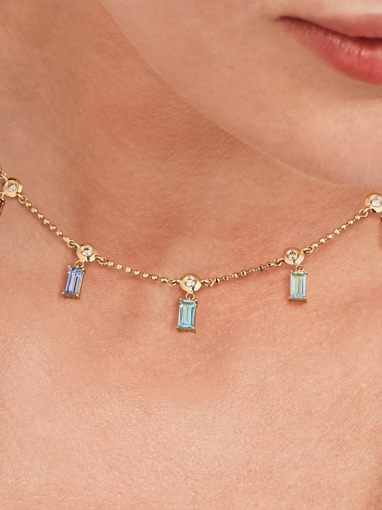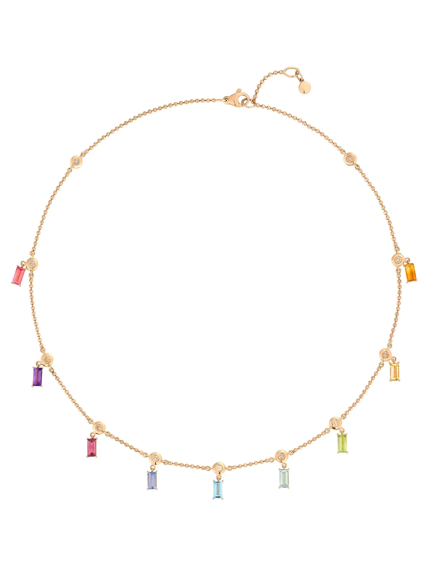 The Blu Colors BY KIM necklace is the perfect splash of color for the coming summer, combining femininity with coolness. The nine baguette-cut colored gemstones are reminiscent of a rainbow in their splendor of color. Each of them drips down from small cinnamon-colored brilliant-cut diamonds, which in turn are linked by a glittering bead chain made of 18k rose gold. This is a composition of contrasts of round and square that lends the design a casual, modern touch.