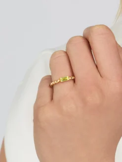 The filigree Blu Colors BY KIM ring blends femininity with an air of coolness and is the perfect companion for everyday wear. The slender row of spherical elements made of 18k rose gold is perfect for combining with other rings, giving even long-standing favorites a colorful update. The straightforward baguette cut of the light-green peridot set in filigree prongs gives the piece its sense of trendy style.