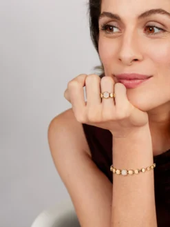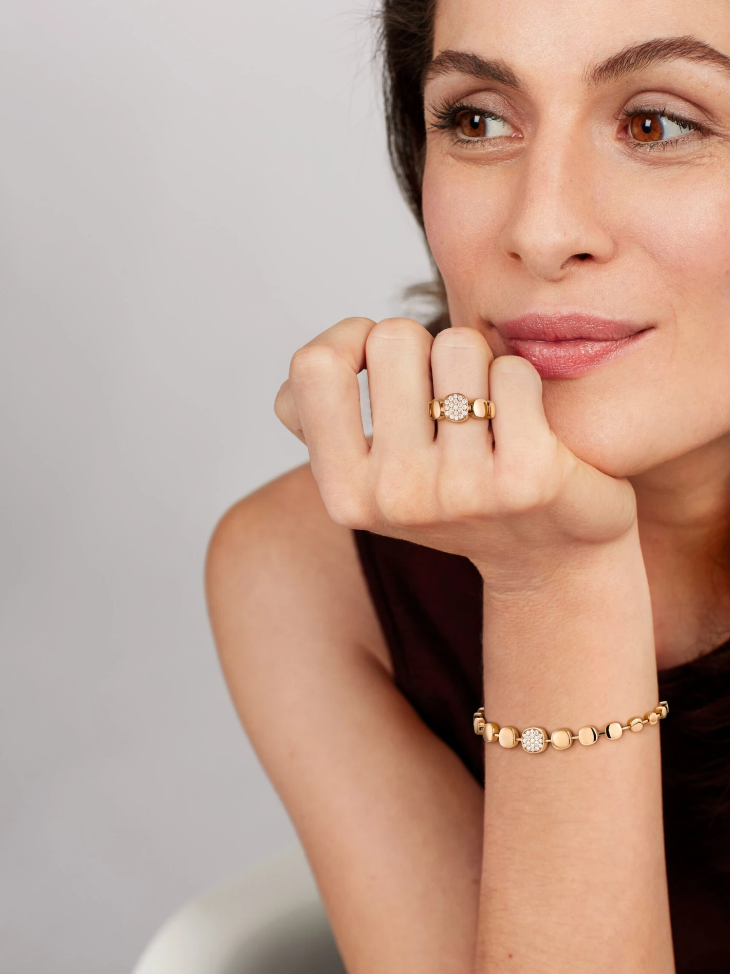 The pavé element with 19 brilliant-cut diamonds and a total carat weight of 0.24 ct clearly forms the center of the Blu Square BY KIM ring. Furthermore, this piece of jewelry enthralls with its refined details. The slightly flattened cushion-shaped elements in 18k rose gold offer a unique wearing comfort and are beautifully arranged in graduated sizes. It can be worn as a solo piece or together with other rings. A versatile companion that you will delight you every day.