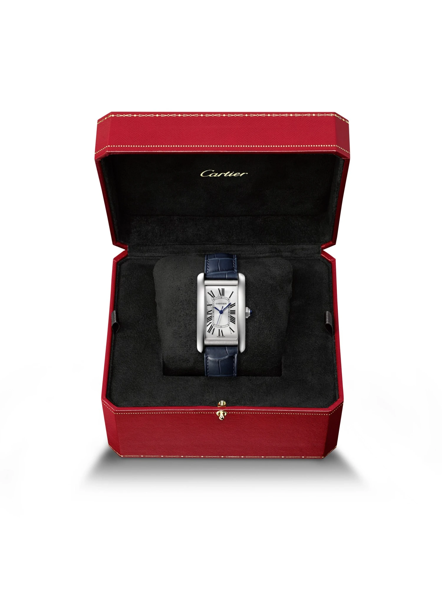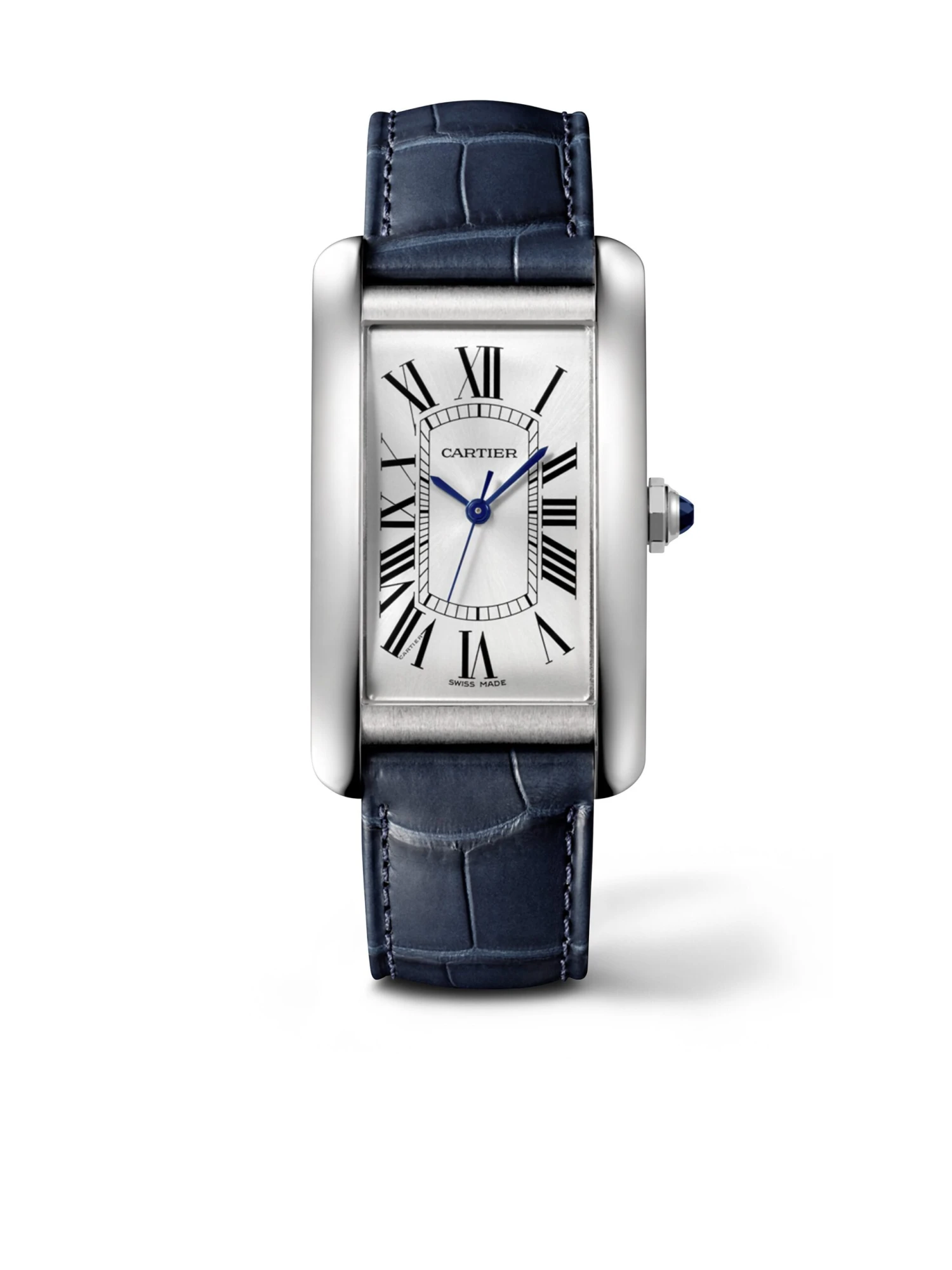 Tank Américaine watch, large model, mechanical movement with automatic winding. Steel case, octagonal crown set with a blue synthetic spinel, silvered dial, blued-steel sword-shaped hands, navy blue semi-matte alligator leather strap, interchangeable deployant buckle. Case dimensions: 45.10 mm x 26.60 mm, thickness: 9.81 mm. Water-resistant up to 3 bar (approx. 30 meters/100 feet).