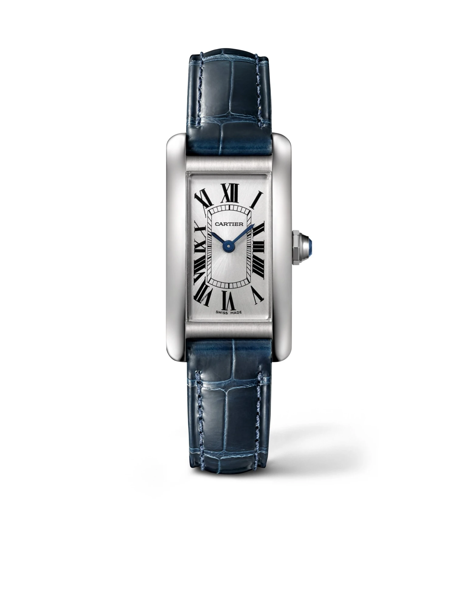 Tank Américaine watch, small model, quartz movement. Steel case, octagonal crown set with a blue synthetic spinel, silver dial, blued-steel sword-shaped hands, navy blue shiny alligator leather strap, ardillon buckle. Case dimensions: 34.80 mm x 19.00 mm, thickness: 7.09 mm. Water-resistant up to 3 bar (approx. 30 meters/100 feet).