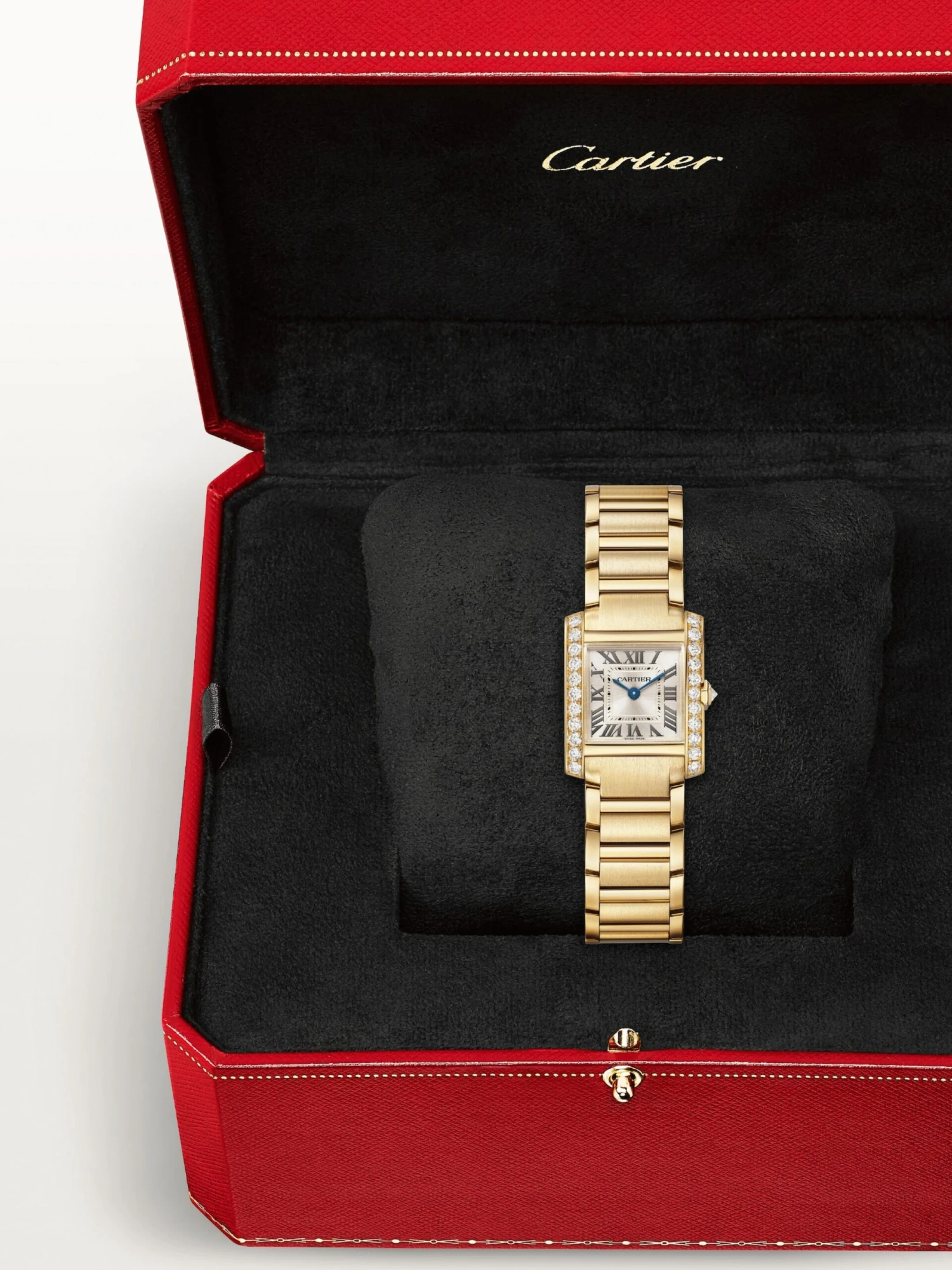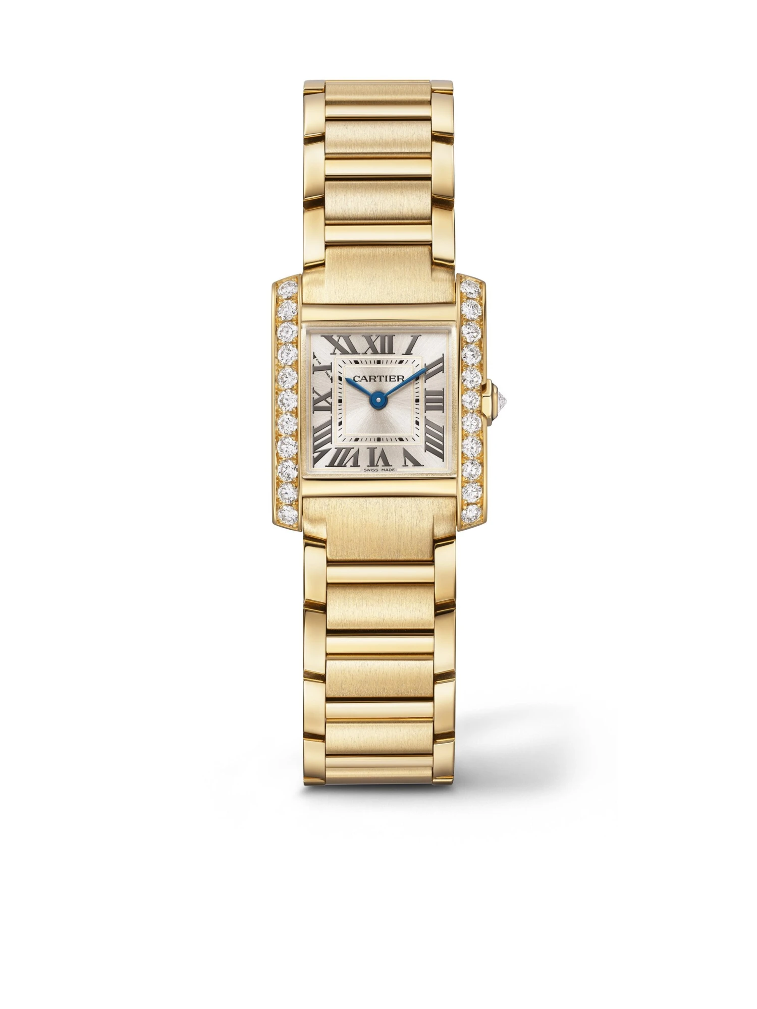 Tank Française watch, small model, quartz movement. Case and faceted crown in 18K white gold (750/1000) set with 23 brilliant-cut diamonds totaling 0.78 carats. Golden sunray dial, blued-steel sword-shaped hands, sapphire crystal. Bracelet in 18K yellow gold (750/1000). Case dimensions: 25.7 mm x 21.2 mm, thickness: 6.8 mm. Water-resistant up to 3 bar (approx. 30 meters/100 feet).