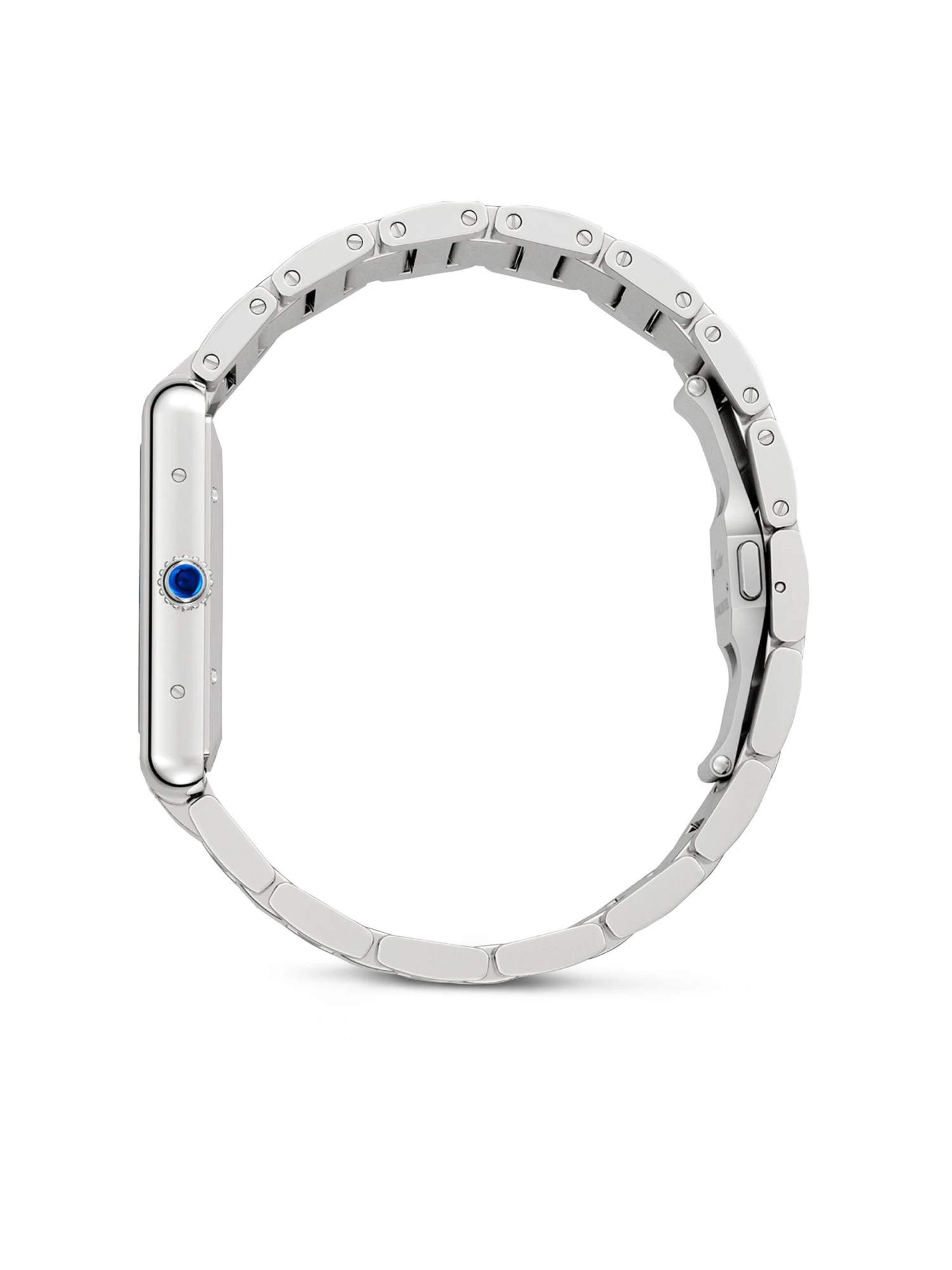 Tank Must watch, extra-large model, mechanical movement with automatic winding, caliber 1847 MC. Steel case, beaded crown set with a synthetic cabochon-shaped spinel, silvered flinqué dial, blued-steel sword-shaped hands, steel bracelet, calendar aperture at 6 o’clock. Case dimensions: 41 mm x 31 mm, thickness: 8.4 mm. Water-resistant up to 3 bar (approx. 30 meters/100 feet).