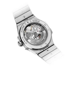 This sports watch is devoted to the Alps and one of their most fascinating animal species, the eagle. The blue galvanized brass dial is decorated with a ray pattern inspired by the iris of the bird of prey. The case, measuring 41.0 by 9.7 millimeters, is water-resistant to ten bar, which corresponds to the pressure at 100 meters, and is made of Lucent steel A223. This new alloy is hypoallergenic, harder than conventional steel and has a particularly intense shine. It is driven by the Chopard 01.01-C self-winding manufacture movement with a power reserve of 60 hours. Its precision is certified by the COSC chronometer certificate. The high-quality ornamentation is displayed under the sapphire crystal case back.