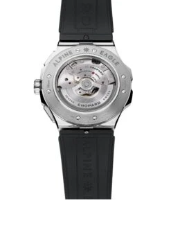 The graphite-black, galvanized dial of the Chopard Alpine Eagle XL Chrono Ref. 298609-3004 is decorated with a ray pattern inspired by the iris of an eagle. The 44-millimeter case is water-resistant to ten bar and is made of Lucent steel A223. This alloy is hypoallergenic and has a particularly intense shine. The chronograph watch is driven by self-winding manufacture movement Chopard 03.05-C with a power reserve of 60 hours. A COSC chronometer certificate attests to its precision. The high-quality ornamentation is displayed under the sapphire crystal case back. The sporty timepiece is fitted on a black rubber strap.