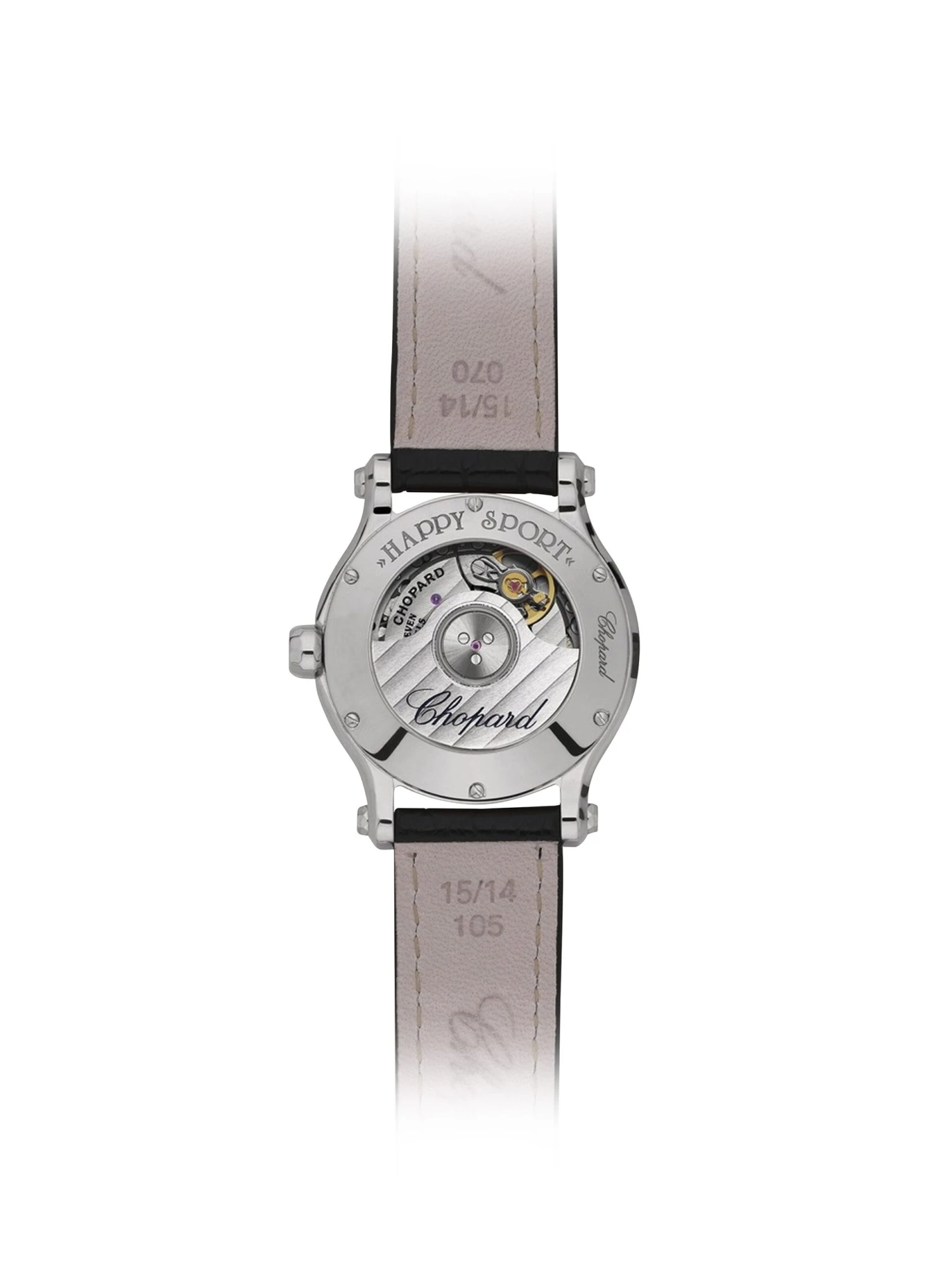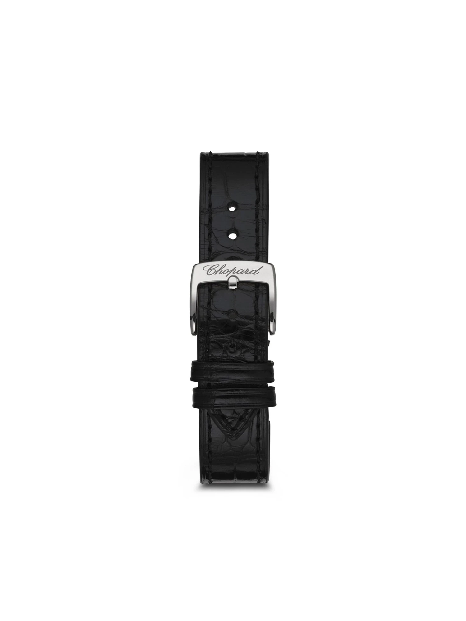Stainless steel and diamonds enter into a sporty, dynamic union in the Happy Sport 30mm Automatic (Ref. 278573-3011). On the silver dial with guilloché decoration in the center, the five free-spinning diamonds sparkle in ever-changing positions. Behind the dial and visible through a transparent caseback, there is self-winding caliber CHOPARD 09.01 with a power reserve of 42 hours. A black alligator-skin strap stylishly completes the creative design of this 30-millimeter ladies’ watch.
