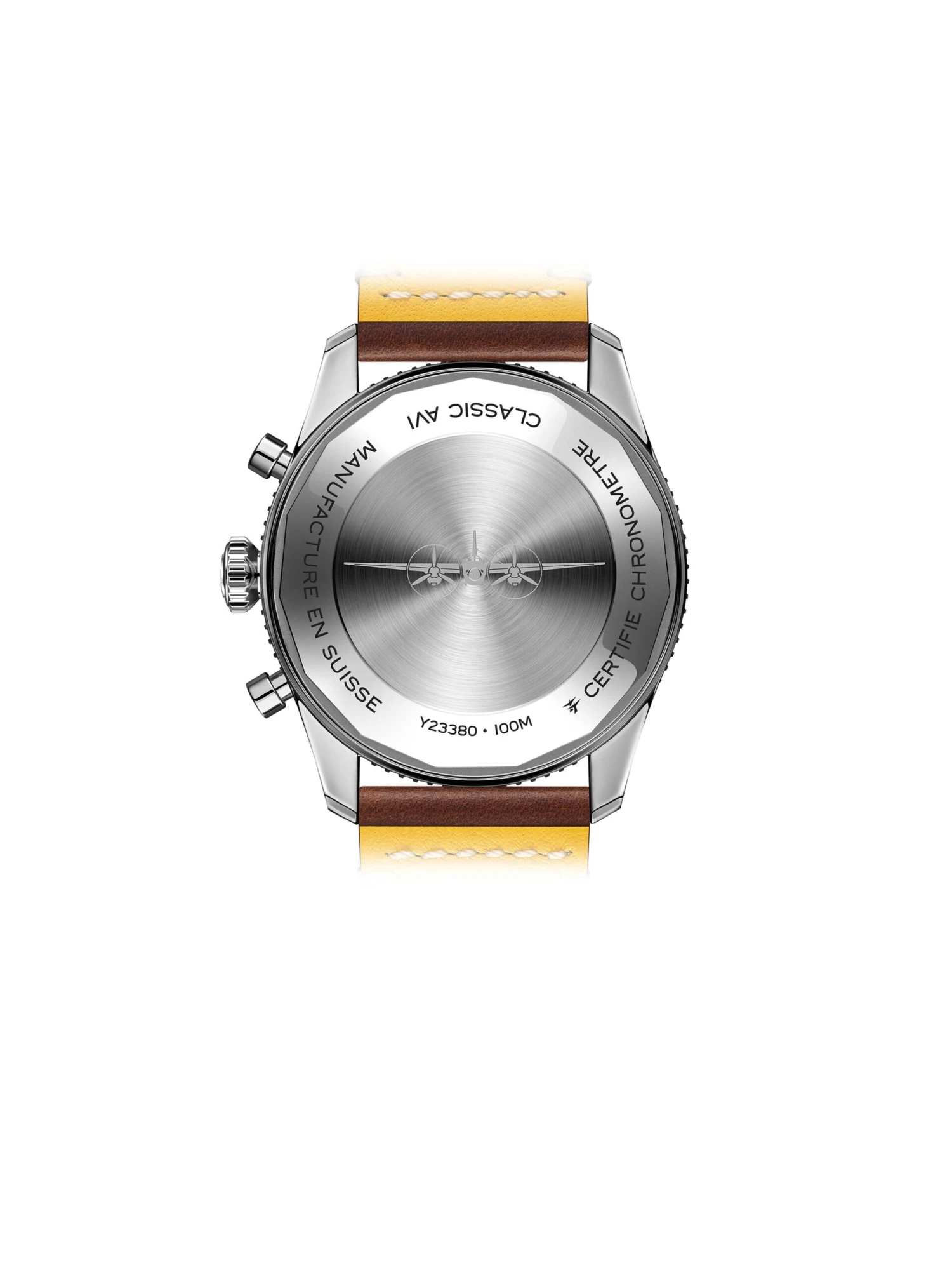 High-contrast, clearly legible Arabic numerals, a knurled bezel for optimal grip, and an engraving on the caseback. The Classic AVI Chronograph 42 Mosquito (Ref. Y233801A1B1X1) celebrates Breitling’s close ties with aviation and defies all challenges on the ground and in the air with its robust stainless-steel case. Inside the case, there is self-winding caliber 23, a reliable manufacture movement that displays the chronograph functions via three totalizers in addition to the time. This version measures 42 millimeters and sits comfortably on the wrist thanks to a brown leather strap.