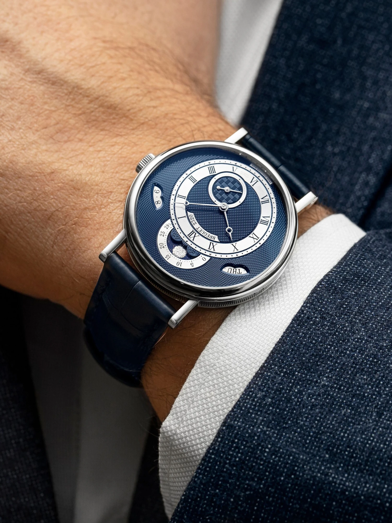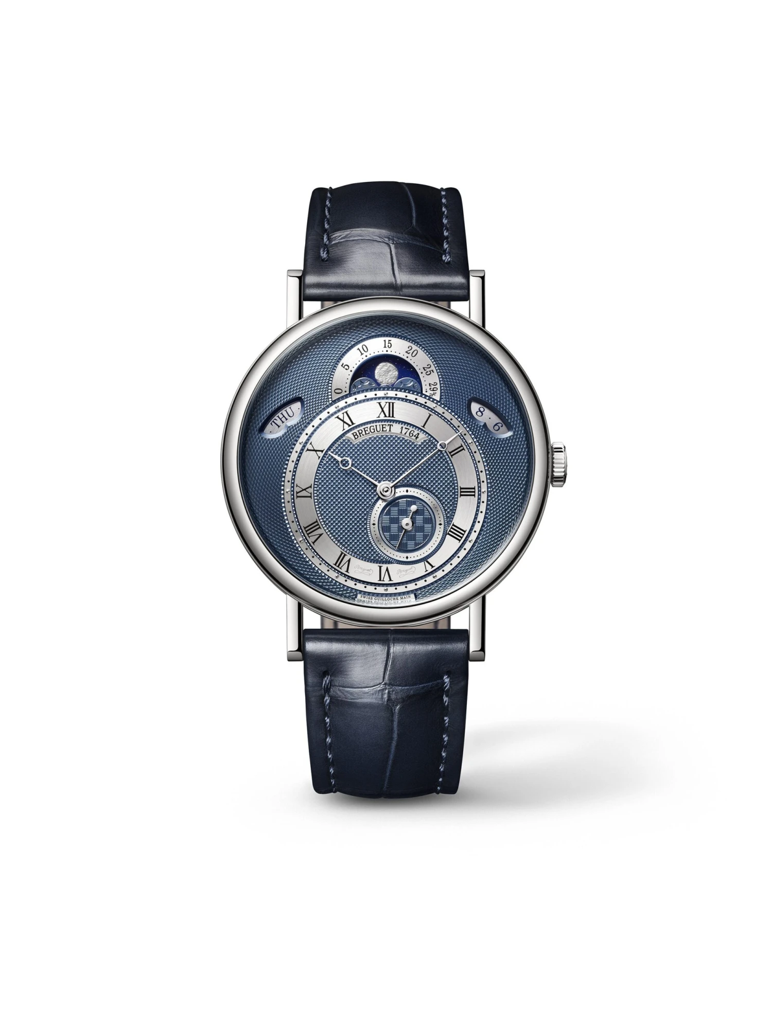 The refined timepieces of the Breguet Classique line are all about accuracy and perfect readability. Stylistically inspired by the brand’s founder, they captivate with an aesthetic reduction down to the bare essentials. The blue dial of the Classique 7337BB in 18K white gold, guilloche-worked by hand, presents a detailed moon phase framed by the date and day display. Within the hour-minute display, the small seconds complication is set on an elegant chessboard motif. The clear design of the dial with its filigree Breguet hands is no less impressive than the automatic movement, caliber 502.3 QSE1 in an 18k white gold case measuring 39 millimeters in diameter and 9.9 millimeters in height, and the silicon hairspring that ensures maximum precision. The blue alligator-skin strap elegantly rounds off the design of this aficionado watch.