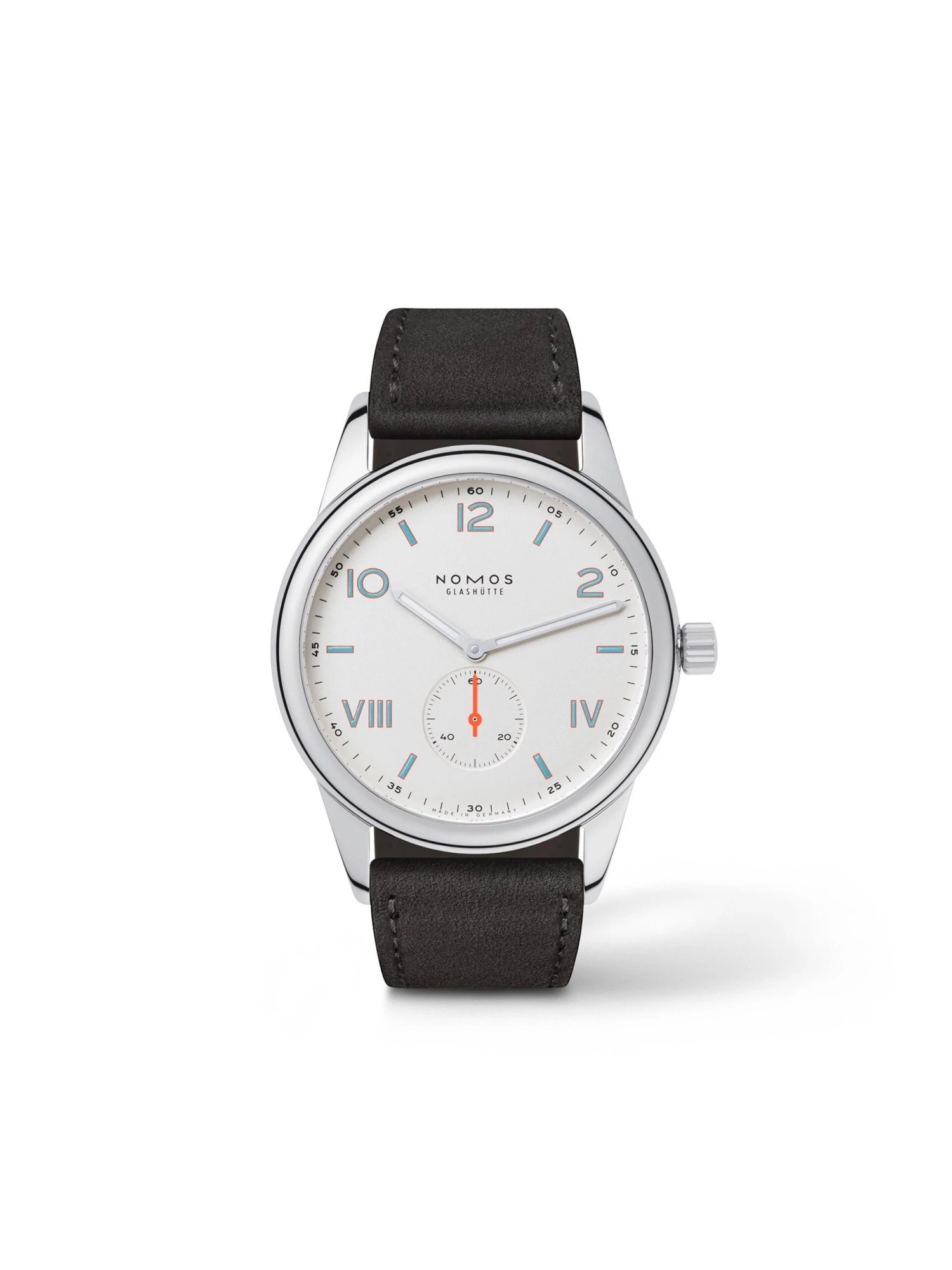 The Club is an entry-level model from NOMOS Glashütte designed to speak to more of a younger clientele. Its special trademark is the mix of Arabic and Roman numerals, which achieve a standout effect on the dark background of the Club Campus 38 Night in both good and bad lighting thanks to the Superluminova coatings. The stainless-steel case, 38 x 8.5 millimeters large, is water-resistant up to 100 meters and comes with the original NOMOS hand-wound movement in the form of an Alpha caliber. The Club Campus 38 Night is worn on a suede strap made of calfskin.