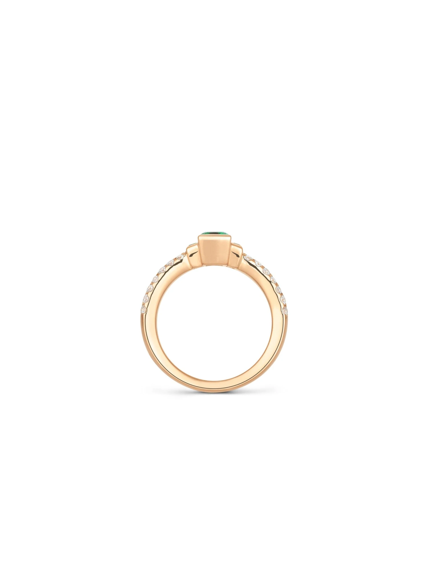 Pastel colors donβt only look tempting, they are also absolutely en vogue in fashion design and provide us with gorgeous outfits. The Colonna light BY KIM ring in 18k rose gold is set in its center with an octagonal-cut green tourmaline, which is flanked on both sides by a column-like tourmaline in a baguette cut. The edge of the ring band is adorned with 28 brilliant-cut diamonds of 0.42 ct in total that give this precious, fresh and contemporary ring additional glamour. It can also be beautifully combined with other rings.