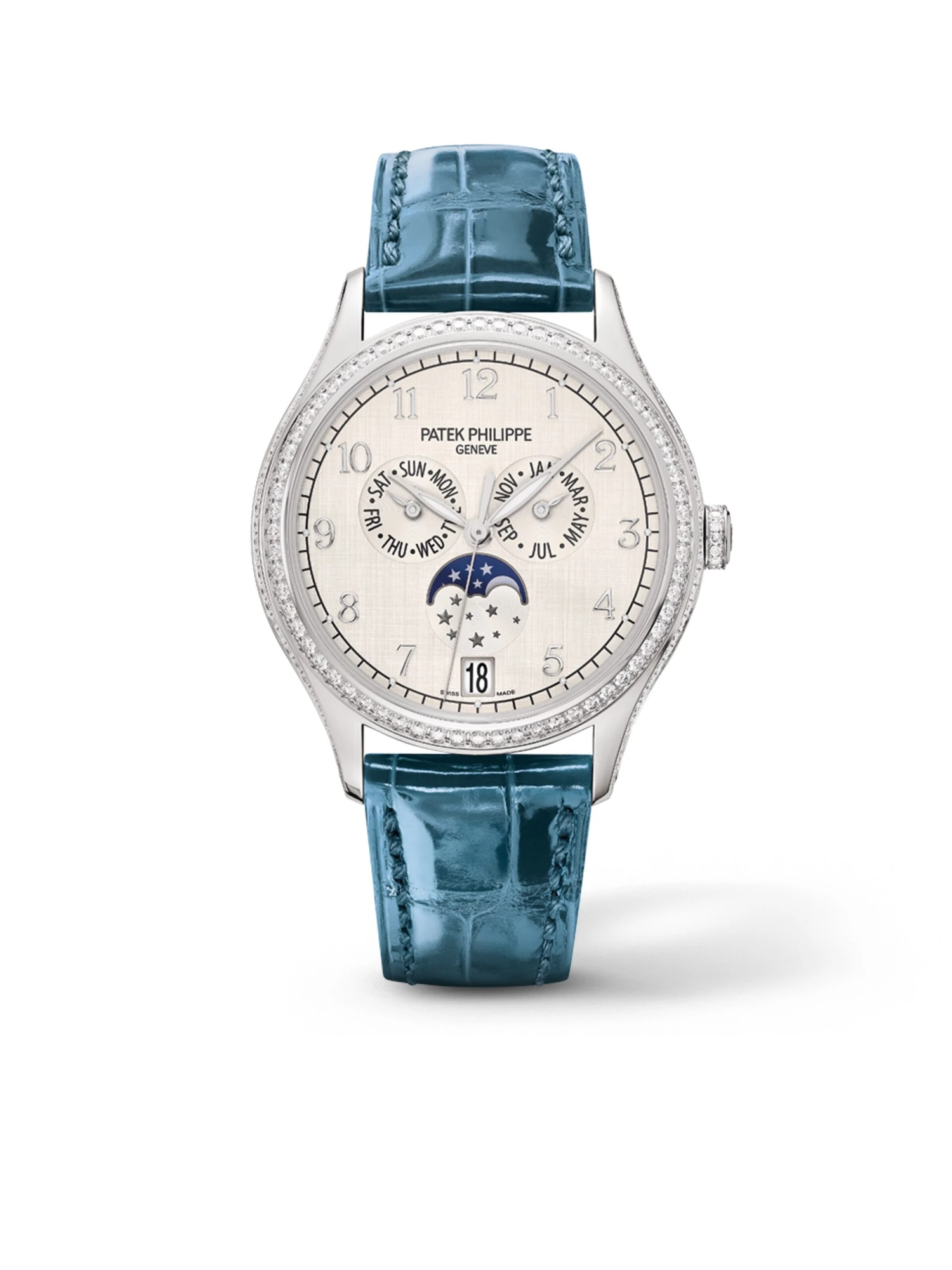 First debuted in 1996, this is one of the watchmaker’s most popular models. It features a patented annual calendar which displays the day of the week, date, and month. The clever mechanism of the 324 S AQ LU self-winding caliber requires manual correction only once a year, when changing from February to March. The 4947G-010 realizes this sophisticated complication – which also displays the moon phase – in an elegant and luxurious manner. The 38.0 x 11.0 millimeter case made of 18k white gold is set with 141 diamonds.