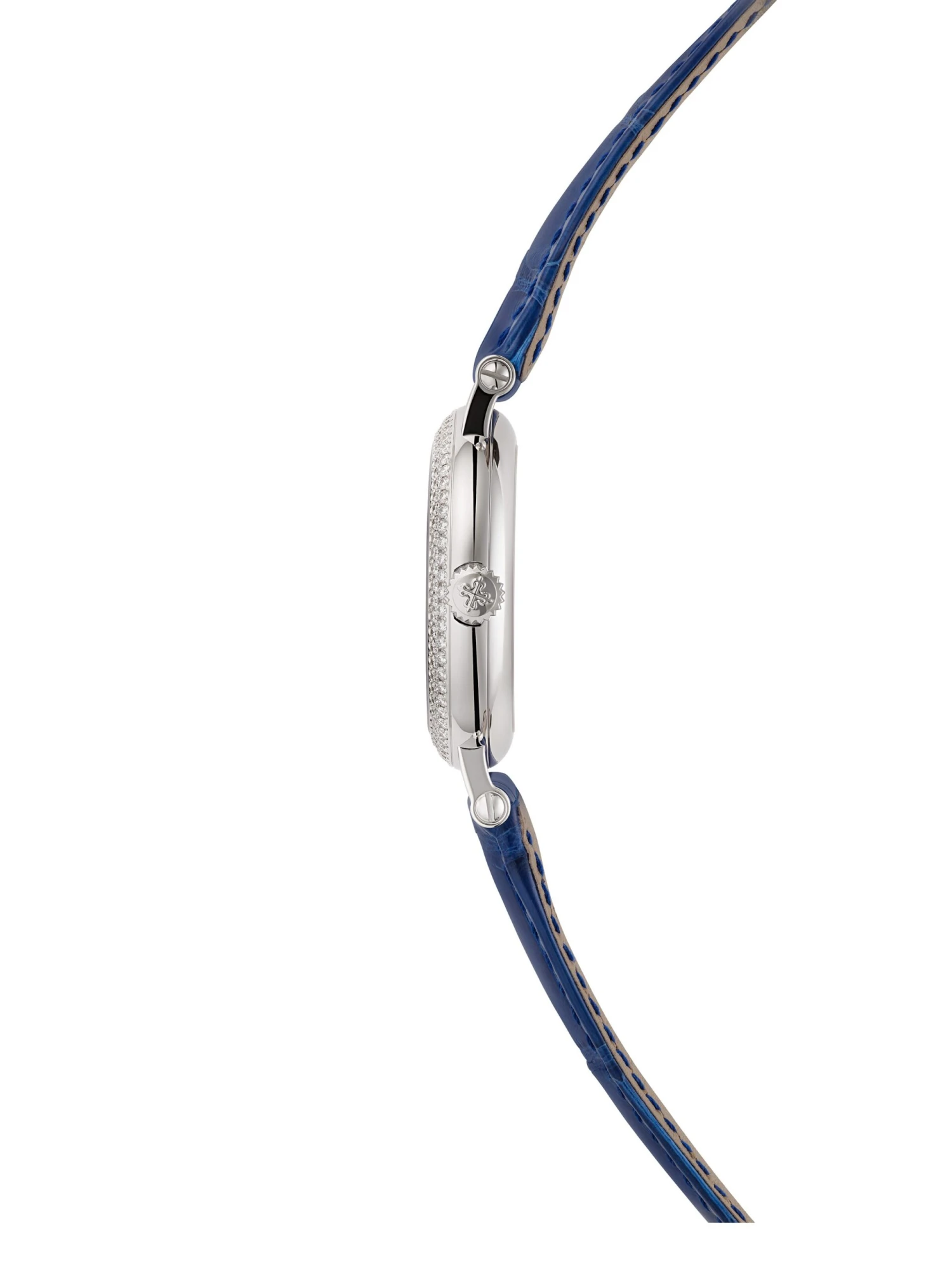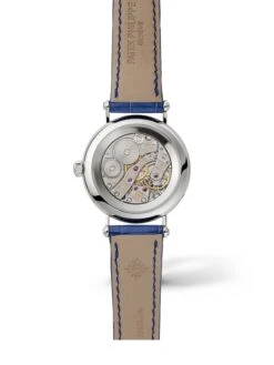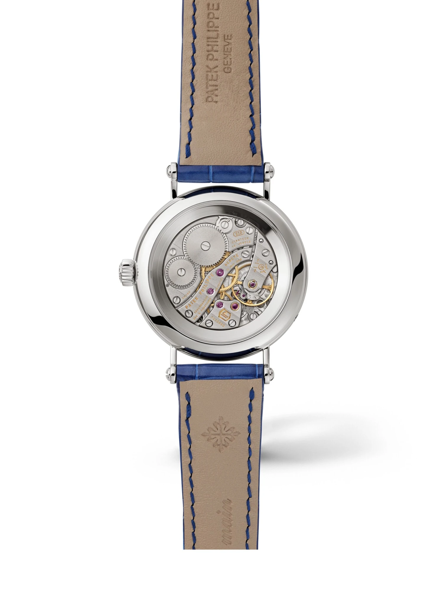 The moon-phase display is considered the most romantic complication as it reflects on the wrist the eternal rise and fall of the earth’s pendant. It takes its most beautiful form in the Ref. 7121/200G-001, where it is makes a statement that is detailed and beautifully color-coordinated with the blue sunburst dial and the 33.0 x 8.35 millimeter case in 18k white gold. It houses the hand-wound caliber 215 PS LU of legendary thinness, with a slim profile of just 3.0 millimeters. Its distinctive presence is enveloped by 132 diamonds of 1.09 ct set on the bezel. The jewelry watch is fitted on a shiny blue alligator-skin strap with square-shaped scales.