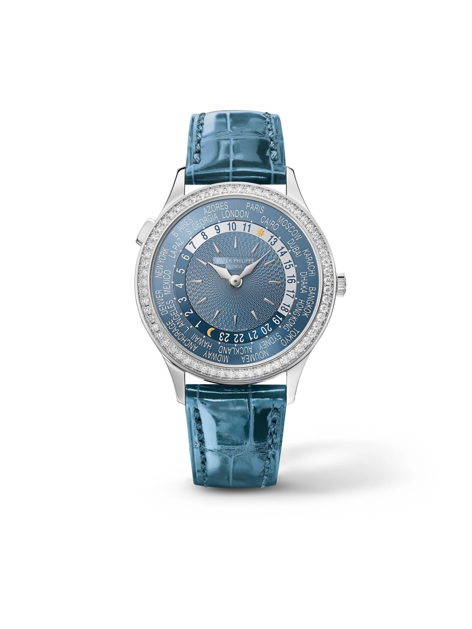 The Patek Philippe 7130R-016 is a world clock for the wrist. The round case made of warm 18k white gold makes a fantastic impression with its 36-millimeter diameter. Inside this case, there is manufacture caliber 240 HU, a mechanical movement with self-winding mechanism. The delicate bezel is adorned with 62 diamonds with a total carat of approx. 0.82 ct, while another 27 diamonds with approx. 0.21 total carat are positioned on the pin clasp. The gray-blue dial with its guilloché decoration done by hand, applied gold hour markers and the display of different time zones is an absolute eye-catcher. A must-have for travelers and global citizens.