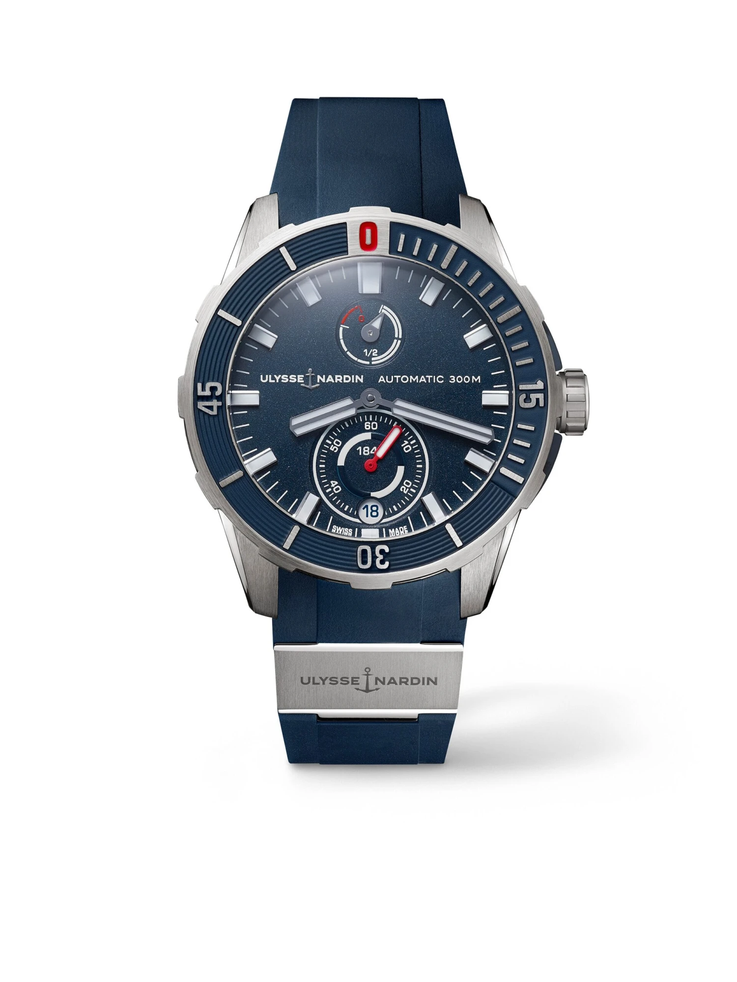 Functional and athletic, and yet also elegant. The Diver Chronometer reliably performs its functions at a pressure of up to 30 bar. The titanium case with a diameter of 44 millimeters encloses an automatic manufacture caliber. This diver’s watch with large luminous markers and hands to match features a unidirectional rotating bezel that is slightly concave, atop a blue rubber strap.
