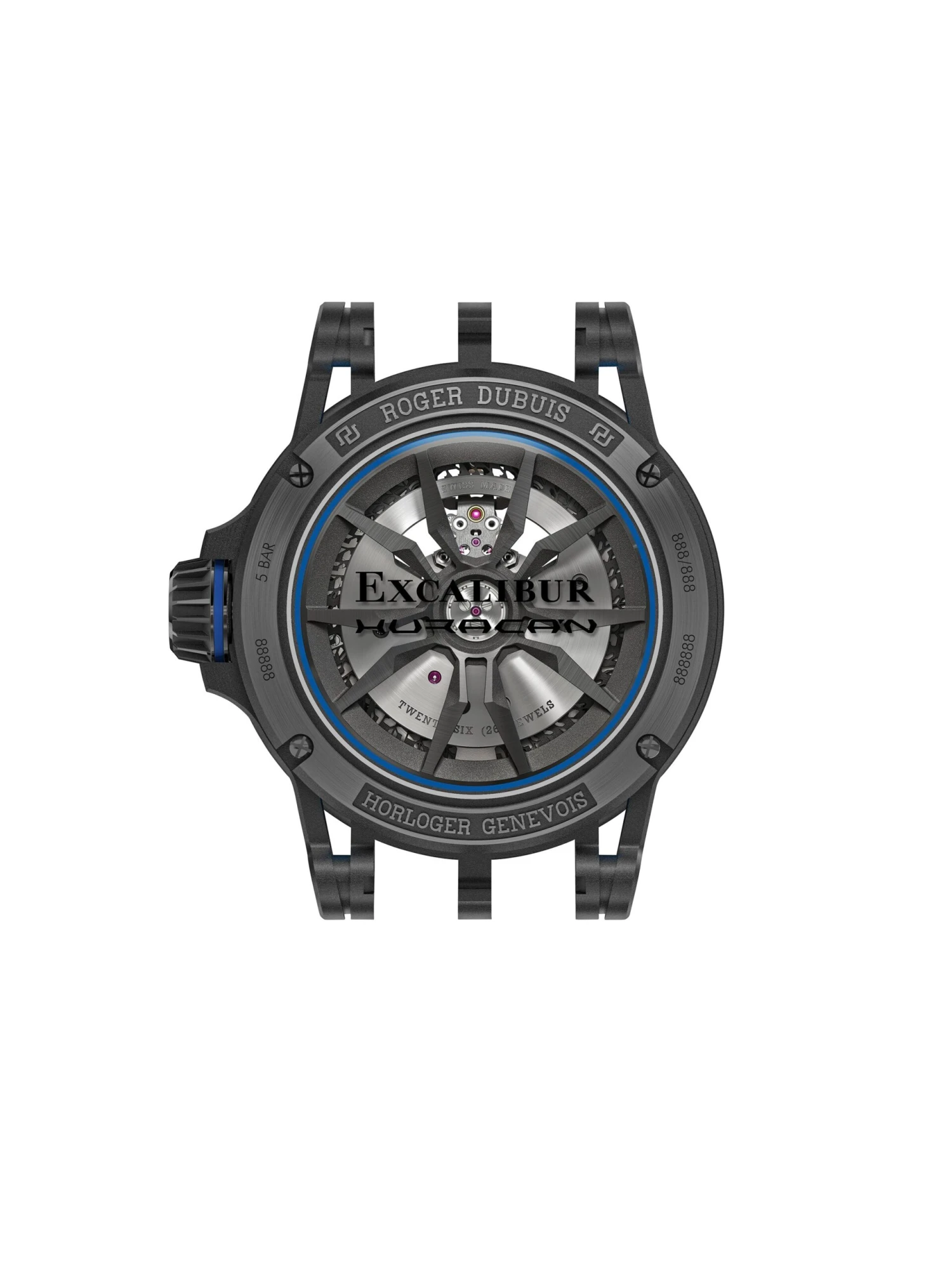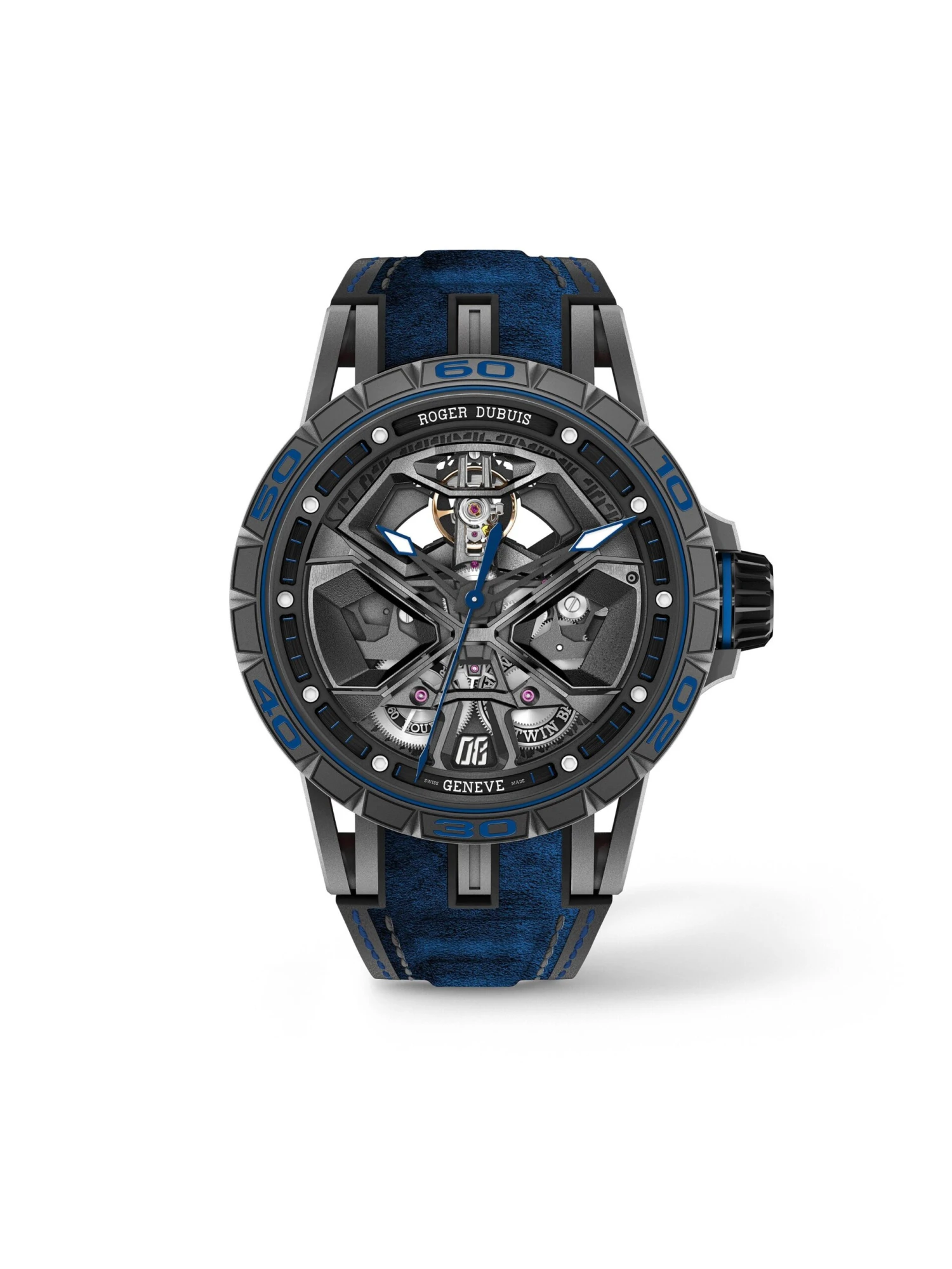 The Roger Dubuis Excalibur combines masculine attributes with the filigree art of Geneva watchmaking. The robust automatic watch with a titanium features a diameter of 45 millimeters and combines a fluted titanium bezel with Roman numerals. The focus of this piece is on the filigree blue hands and the virtuoso skeletonization of the dial, which is perfectly presented by the sapphire crystal case back. The blue natural rubber strap with leather overlay perfectly tops off the extremely sporty appearance.