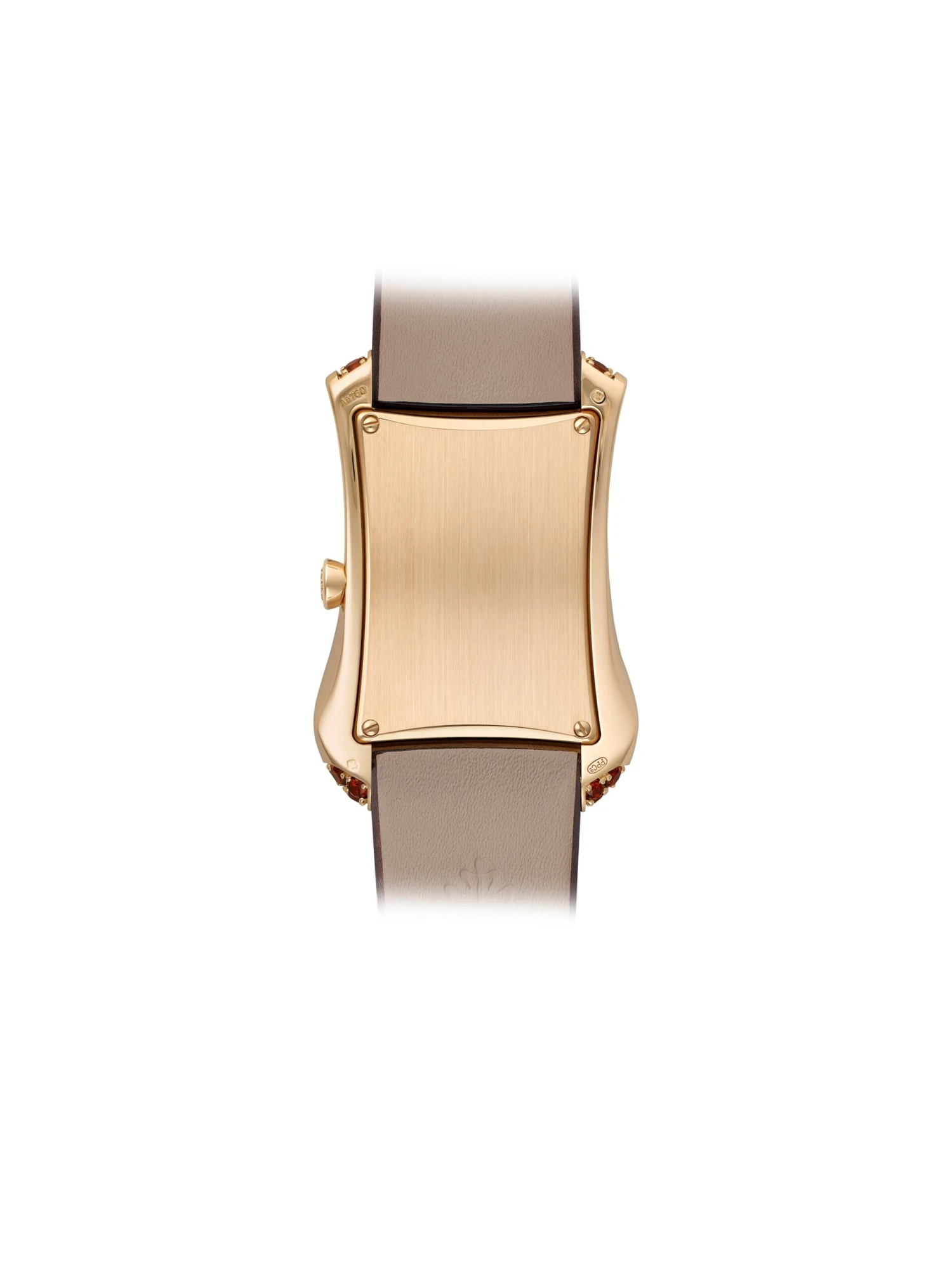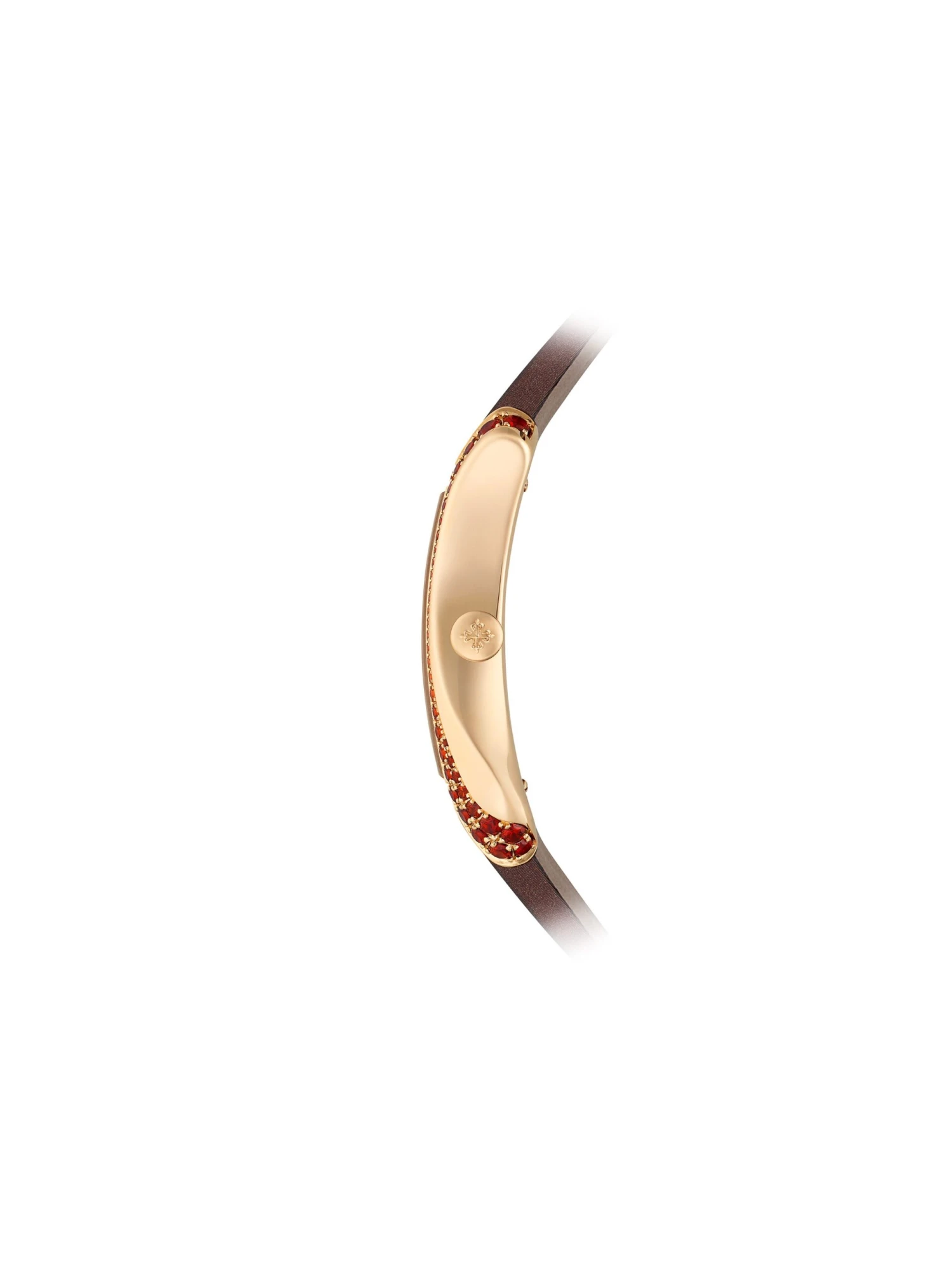 A masterful play of warm colors can be found in the relaunched Gondolo Serata from Patek Philippe. Soberly listed as Ref. 4962/200R-001, the full beauty of the jewelry watch can be admired above all in the light. The color gradient of the 94 brilliant-cut spessartites then comes into its own particularly well – ranging from cognac to bright orange. The gemstones of 2.02 ct in total adorn the finely curved rose gold case. The brown lacquered dial with a floral motif plays on the contrast between matte and polished finishes. This play is complemented by two applied Breguet numerals and two hands, also made of rose gold. The perfect finishing touch in terms of color is the chocolate brown leather strap with a satined finish.