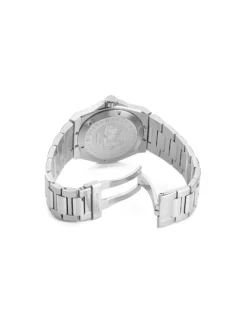 Inspired by the dauntless steel construction workers of the New York skyscrapers from the 1920s, the Wempe Glashütte I/SA Iron Walker collection distinguishes itself by the powerful combination of technical expertise and casual business style. The stainless-steel watch with sporty accents offers more than a conventional three-hand watch. The framed date display at 3 o’clock and the striking baton hands with Super-Luminova® coating are delicate details that radiate a certain air of refinement. The 40-millimeter stainless-steel case with a height of only 9.75 millimeters houses a self-winding movement caliber ETA 2892-A2, is water-resistant to 10 bar, and features a blue dial with a very clear appearance. A watch that shows elegance and character.