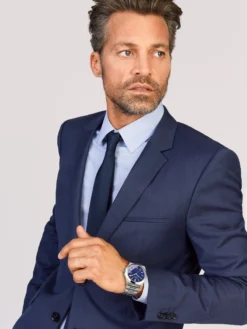 Inspired by the dauntless steel construction workers of the New York skyscrapers from the 1920s, the Wempe Glashütte I/SA Iron Walker collection distinguishes itself by the powerful combination of technical expertise and casual business style. The stainless-steel watch with sporty accents offers more than a conventional three-hand watch. The framed date display at 3 o’clock and the striking baton hands with Super-Luminova® coating are delicate details that radiate a certain air of refinement. The 40-millimeter stainless-steel case with a height of only 9.75 millimeters houses a self-winding movement caliber ETA 2892-A2, is water-resistant to 10 bar, and features a blue dial with a very clear appearance. A watch that shows elegance and character.