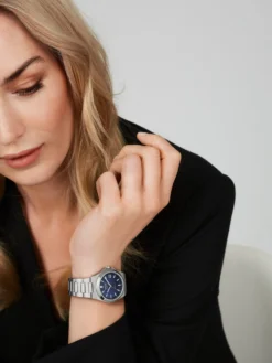 Inspired by the dauntless steel construction workers of the New York skyscrapers from the 1920s, the Wempe Glashütte I/SA Iron Walker collection distinguishes itself by the powerful combination of technical expertise and sparkling elegance. The individualized stainless-steel watch with sporty accents appeals above all to strong, self-assured women and offers more than a conventional three-hand watch: The framed date display at 3 o’clock and the striking baton hands with Super-Luminova® coating are delicate details that radiate a certain air of refinement. The 36-millimeter stainless-steel case with a height of only 9.30 millimeters houses a self-winding movement caliber ETA 2892-A2, is water-resistant to 10 bar, and features a blue dial with a very clear appearance. A watch that shows elegance and character and fits perfectly around even the most delicate wrist thanks to its three-row stainless-steel bracelet.