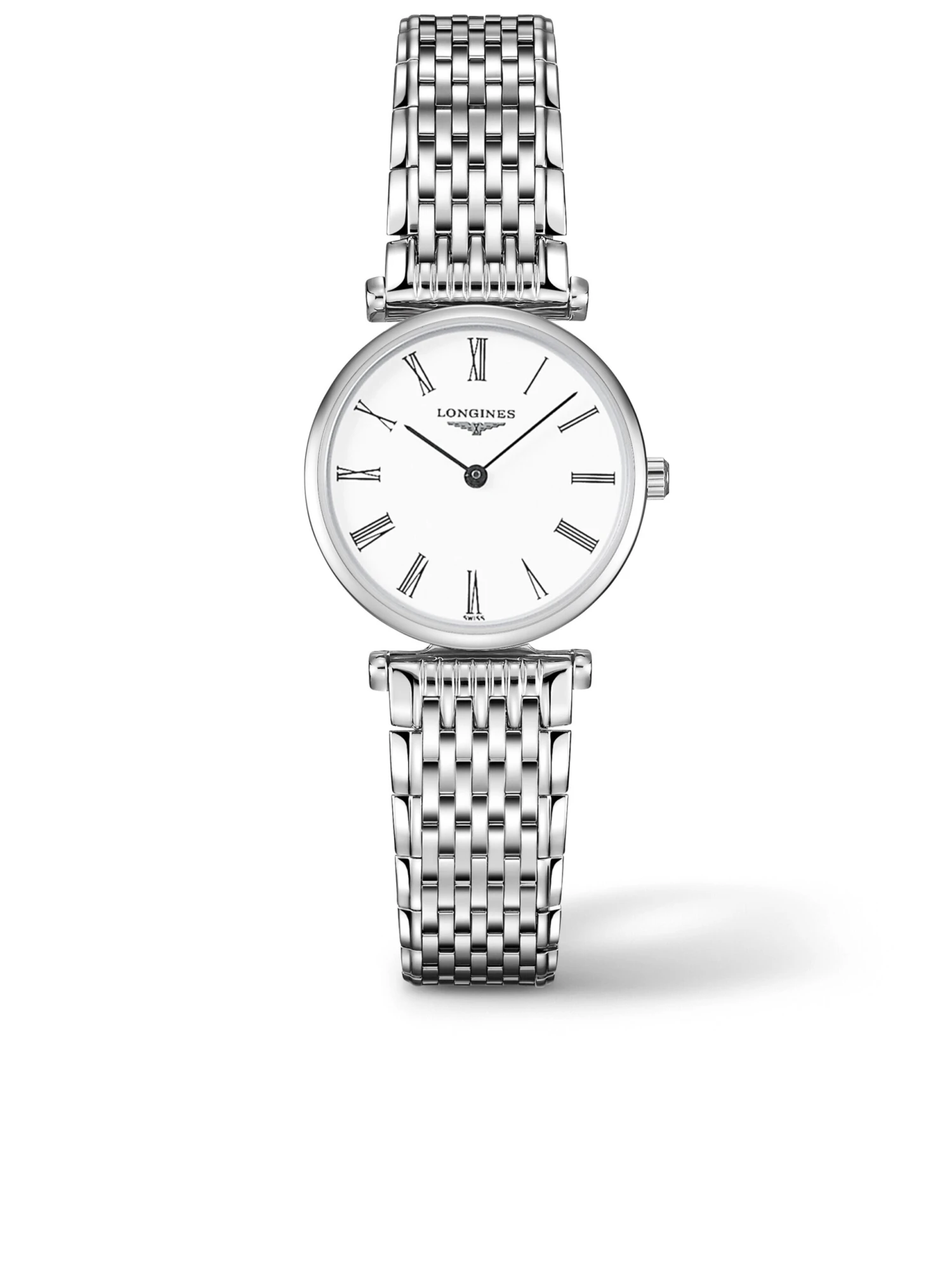 Measuring just 24 millimeters in diameter and featuring a filigree stainless steel strap, the Grand Classique is the perfect companion for a truly feminine appearance. The two-hand quartz watch provides discreet elegance with its white dial and black Roman numerals.