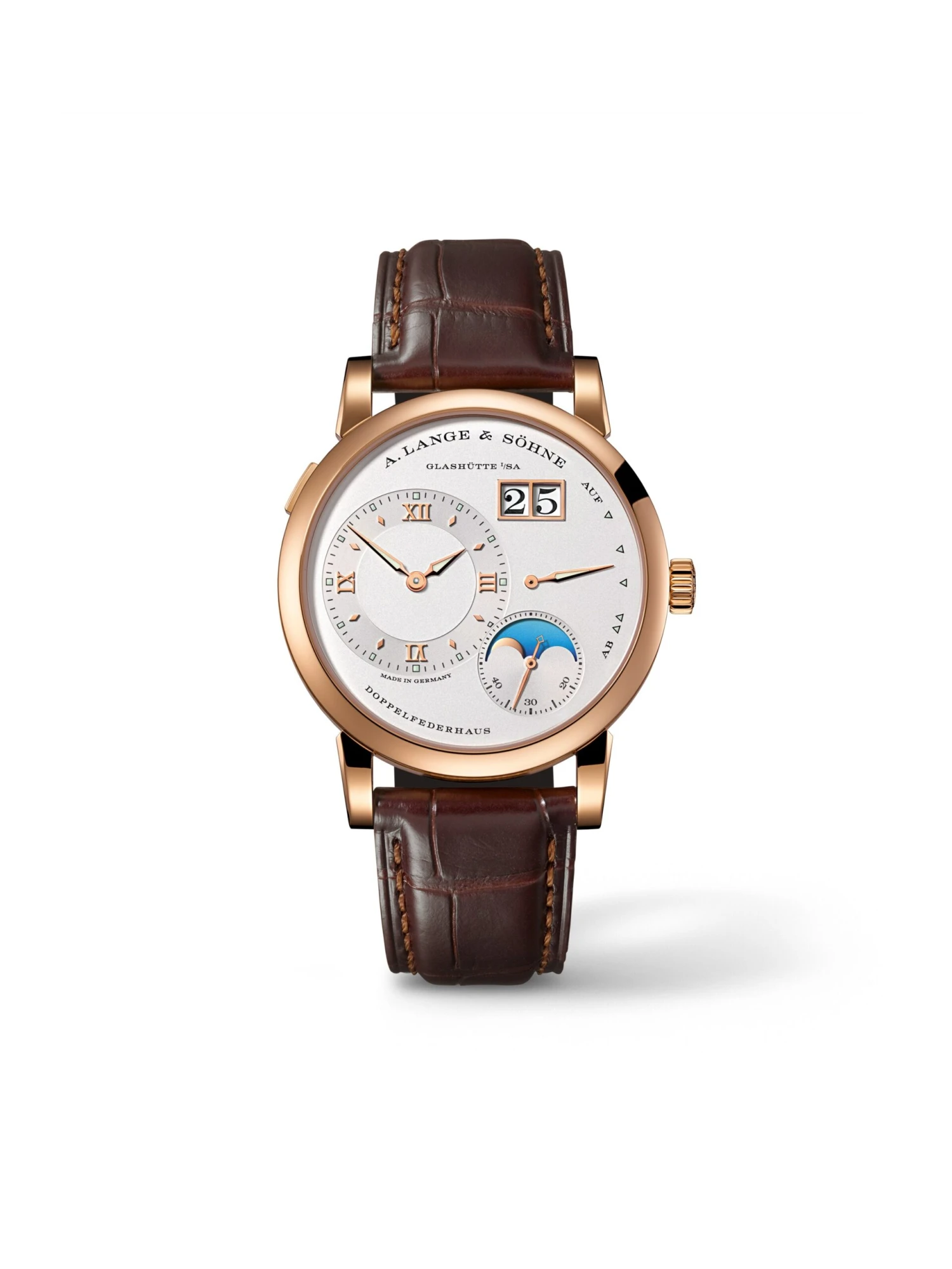 With a silver dial and a 38.5 x 10.2 millimeter rose gold case, the Lange 1 Moon Phase is the perfect watch for every occasion. The moon, made of white gold, reproduces the orbital phase with 99.998 percent precision. During the day, it can be seen on a light blue sky disc with no stars, and in the evening against a dark blue sky with 383 stars. The hand-wound caliber has a power reserve of 72 hours.