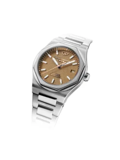 The Laureato is a watch icon of the 1970s. To this day, it has retained its very own charisma. With the Laureato 38 mm Ref. 81005-11-3154-1CM, Girard-Perregaux presents a medium-sized unisex model that skillfully showcases the characteristics of the line. The octagonal bezel, whose polished and satin-finished surfaces reflect the light, the case that merges directly into the bracelet without lugs, and the dial decorated with a refined Clous-de-Paris pattern – here in warm copper. The stainless-steel case, water-resistant to ten bar, has a diameter of 38 millimeters and a height of 10 millimeters. Inside it, there is a true classic of the brand: self-winding caliber GP03300 with date display.