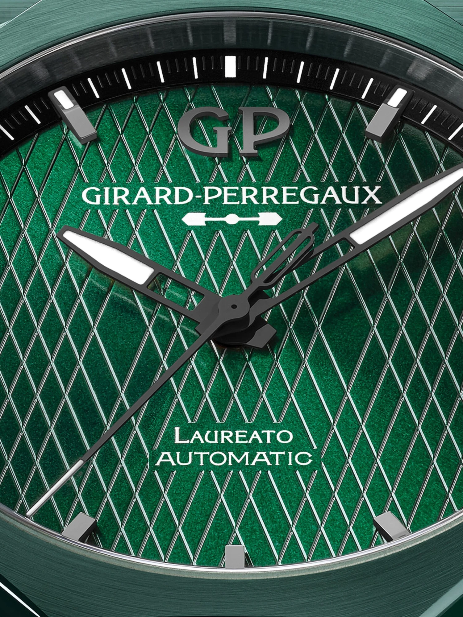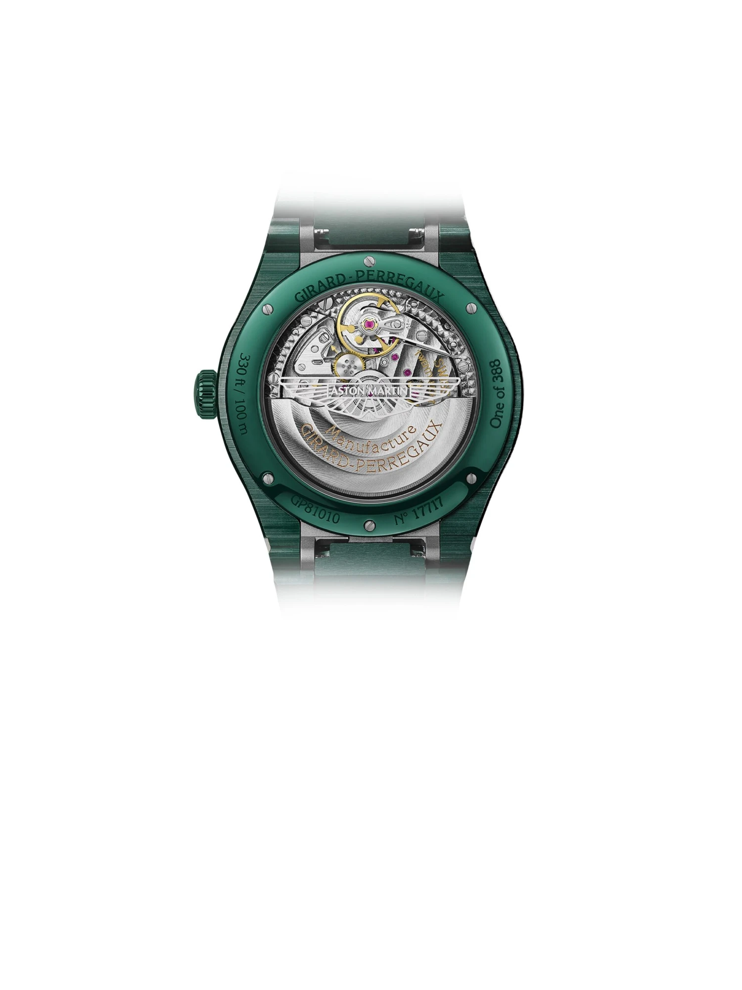 An icon in an all-green look, limited to only 188 watches. The Laureato 38 mm Green Ceramic Aston Martin Edition (Ref. 81005-32-3080-1CX) is an elegant reinterpretation of the popular line, surprising with a sporty touch and design influences from Aston Martin. In addition, the 38-millimeter model made of green ceramic presents the classic features of the original: an octagonal bezel with polished and satin-finished surfaces, an integrated bracelet, and a finely decorated dial – here in noble green with a cross-hatching. Inside the case, there is caliber GP03300-2166, a first-rate self-winding manufacture movement that shows off its precise work through a transparent caseback. Whether in everyday life or on special occasions: A power reserve of 46 hours, a date display at three o’clock, and a water resistance of up to 100 meters make this exclusive special model the ideal companion.