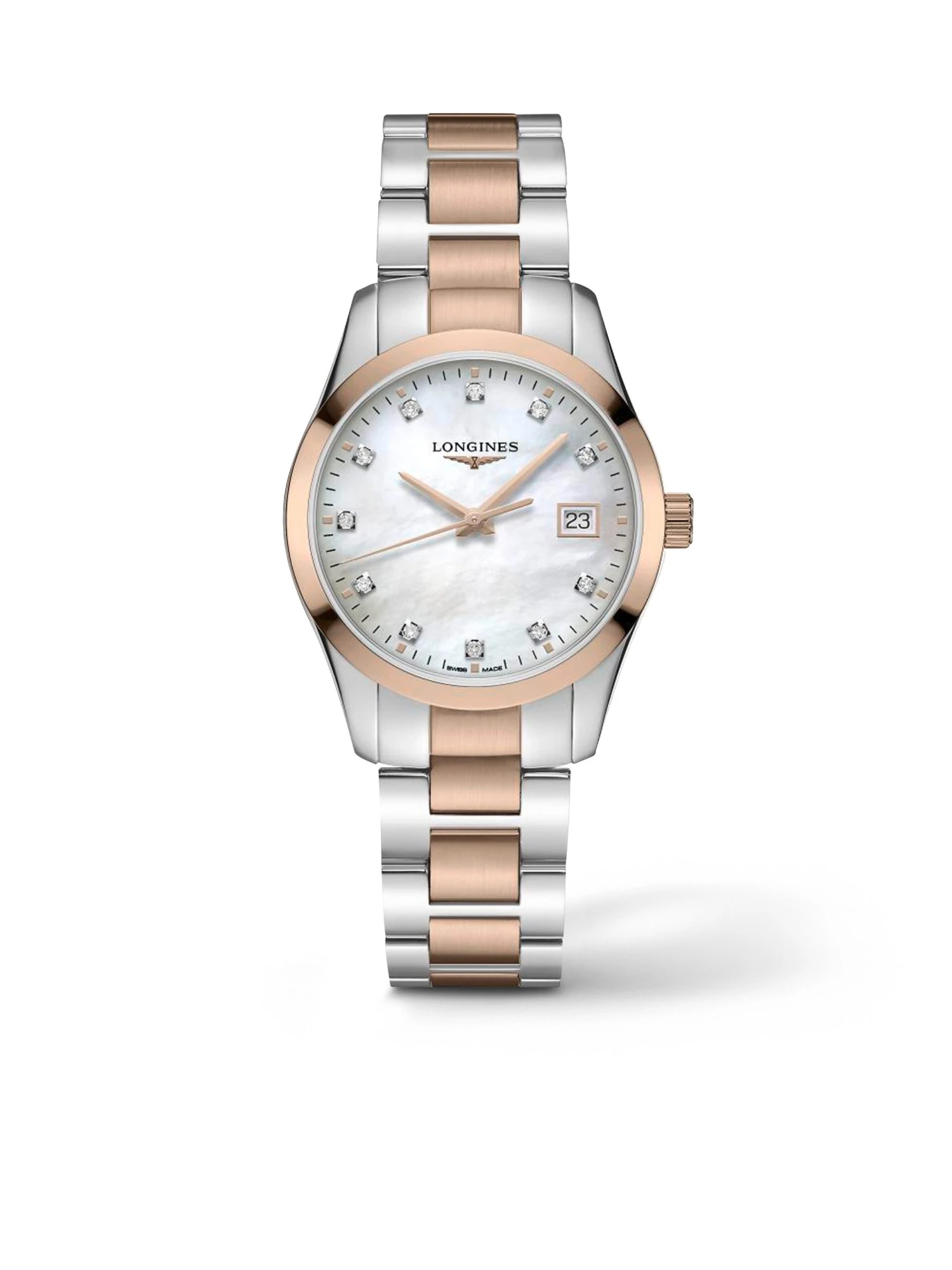 Longines proves with the Conquest Classic that sports watches can also be elegant. This ladies’ watch masterly combines the cool sheen of stainless steel with the warm hue of rose gold. Applied hour markers and a dial with sunray decoration lend the watch a special gleam, especially when the light shines on it.
