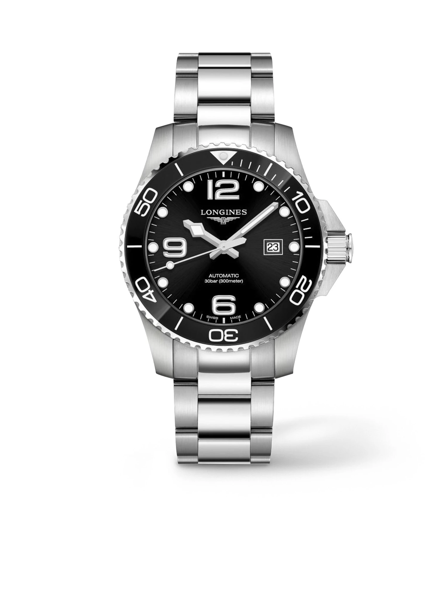 A diving icon: The Longines HydroConquest Ref. L3.782.4.56.6 ticks with an automatic movement in a stainless steel case with a generous 43 millimeters diameter. A black, unidirectional rotating bezel made of ceramic, crown protection and a screw-down case back convince water sports enthusiasts of the three-hand watch, which is water-resistant to 30 bar. The hands, numerals and markers coated with Swiss Super-LumiNova ensure perfect readability even in difficult lighting conditions.