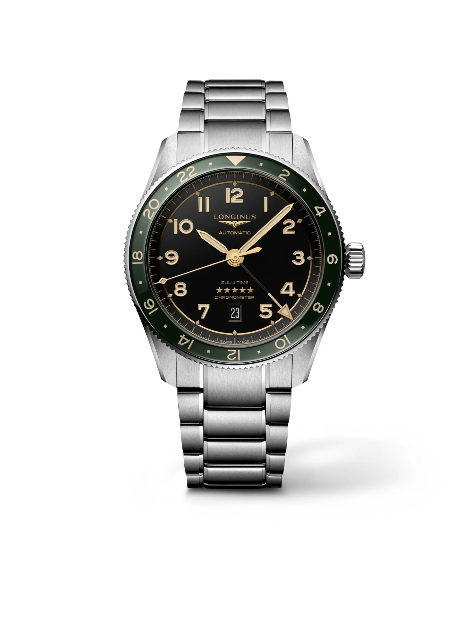 With the Longines Spirit Zulu Time Ref. L3.812.4.63.6, the Swiss brand pays tribute to its first time zone watch, which was launched in 1925 and had the Zulu signal flag on its dial (Z stands for world time). The new precision watch convinces with cutting-edge technology and an aesthetic design. The 42-millimeter stainless-steel case shines with a green, unidirectional rotating bezel and an anthracite dial with a black-gold GMT. The golden, applied numerals and the hands are perfectly readable even in the dark thanks to their Super-Luminova® coating. Inside the case, which is water-resistant to 10 bar, there is COSC-certified self-winding caliber L844.4 with a power reserve of 72 hours. The stainless-steel bracelet with triple safety folding clasp and pushpiece opening mechanism guarantees a secure fit on the wrist.