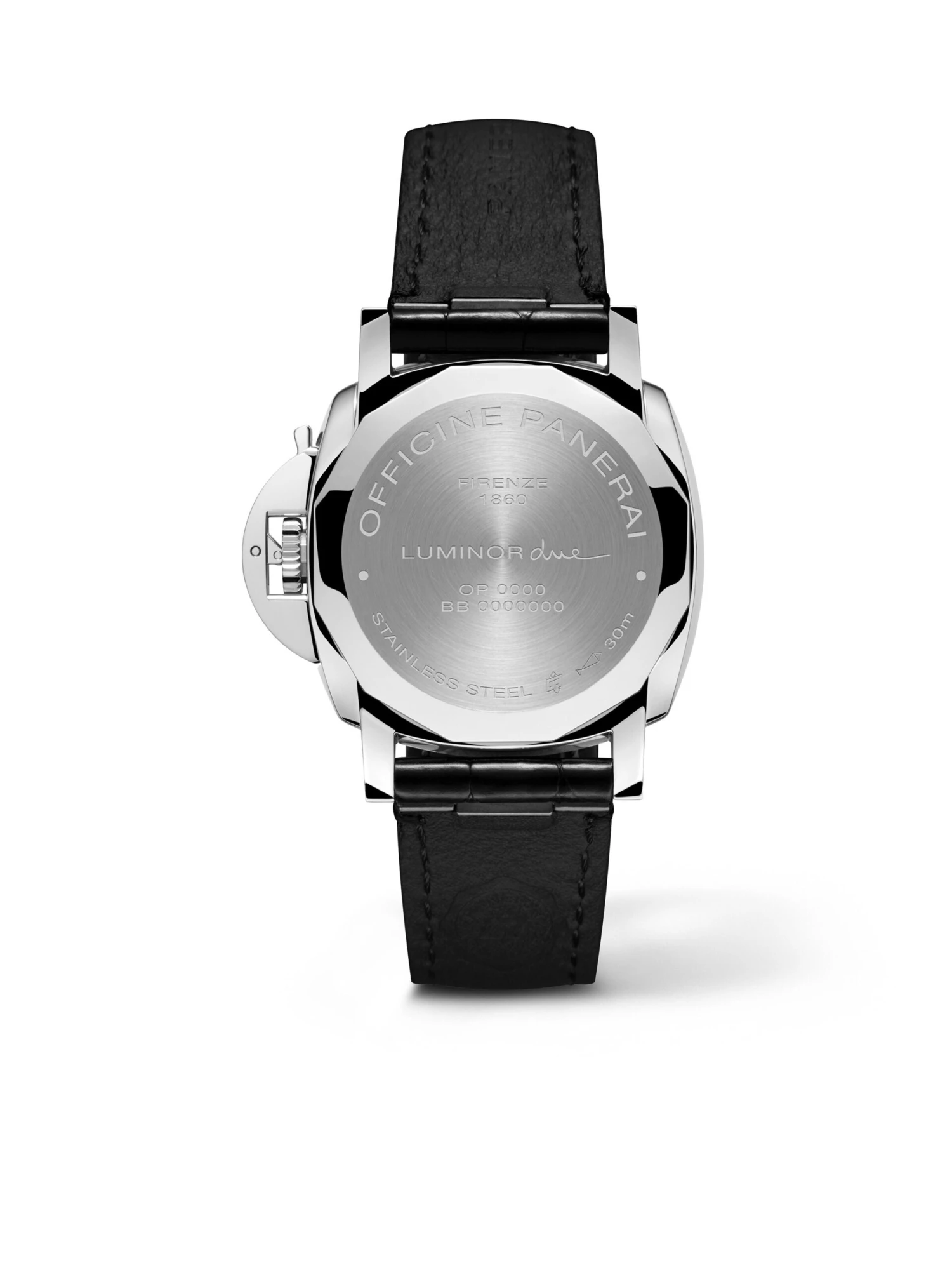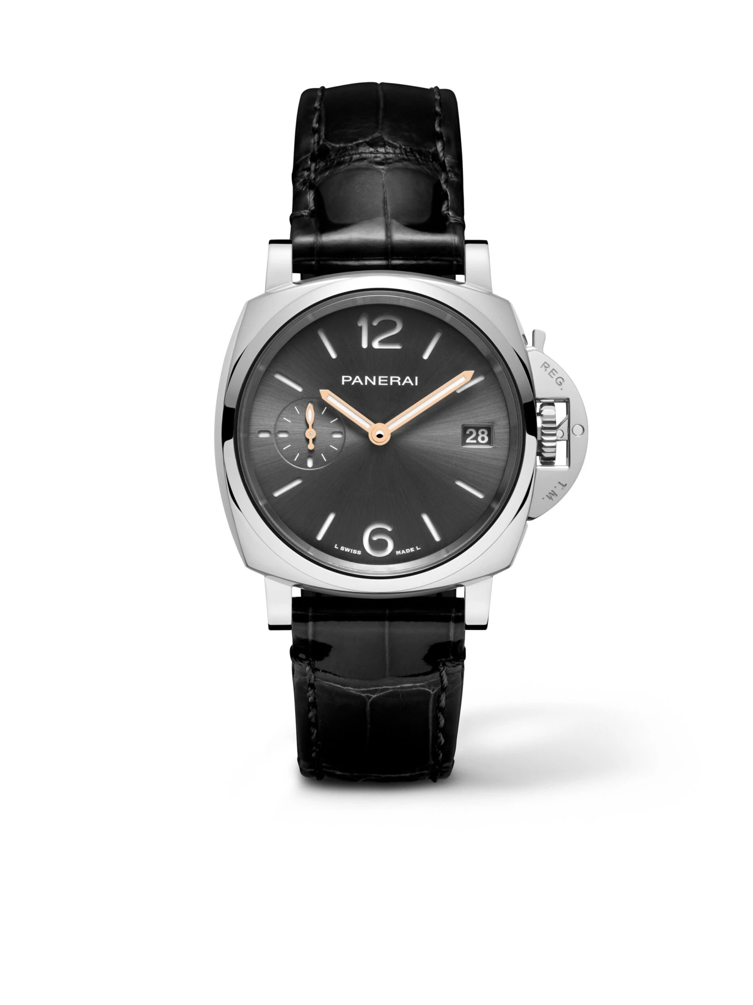 The typical elements of the Luminor collection present themselves in a revised version refined with a timeless color combination: The Luminor Due convinces with a black dial with sunray decoration and easy-to-read, fluorescent numerals and hour markers. The hands are also noctilucent. The typical cushion-shaped case measures 38 millimeters in diameter, is made of stainless steel, and contrasts elegantly with the black alligator skin strap.