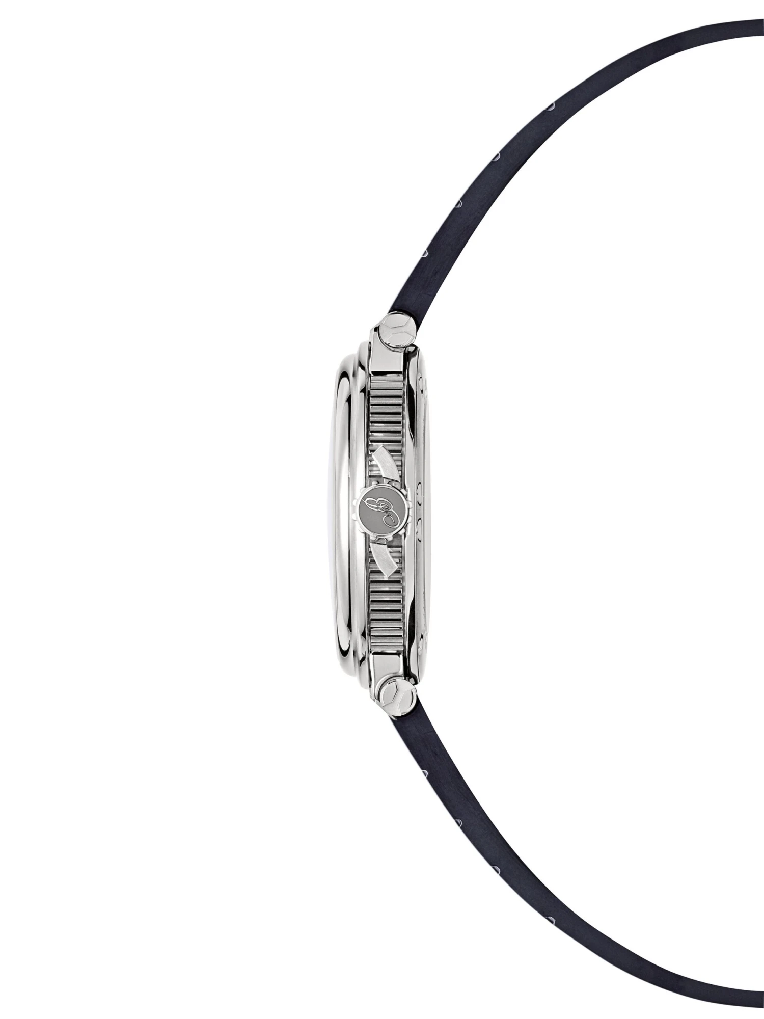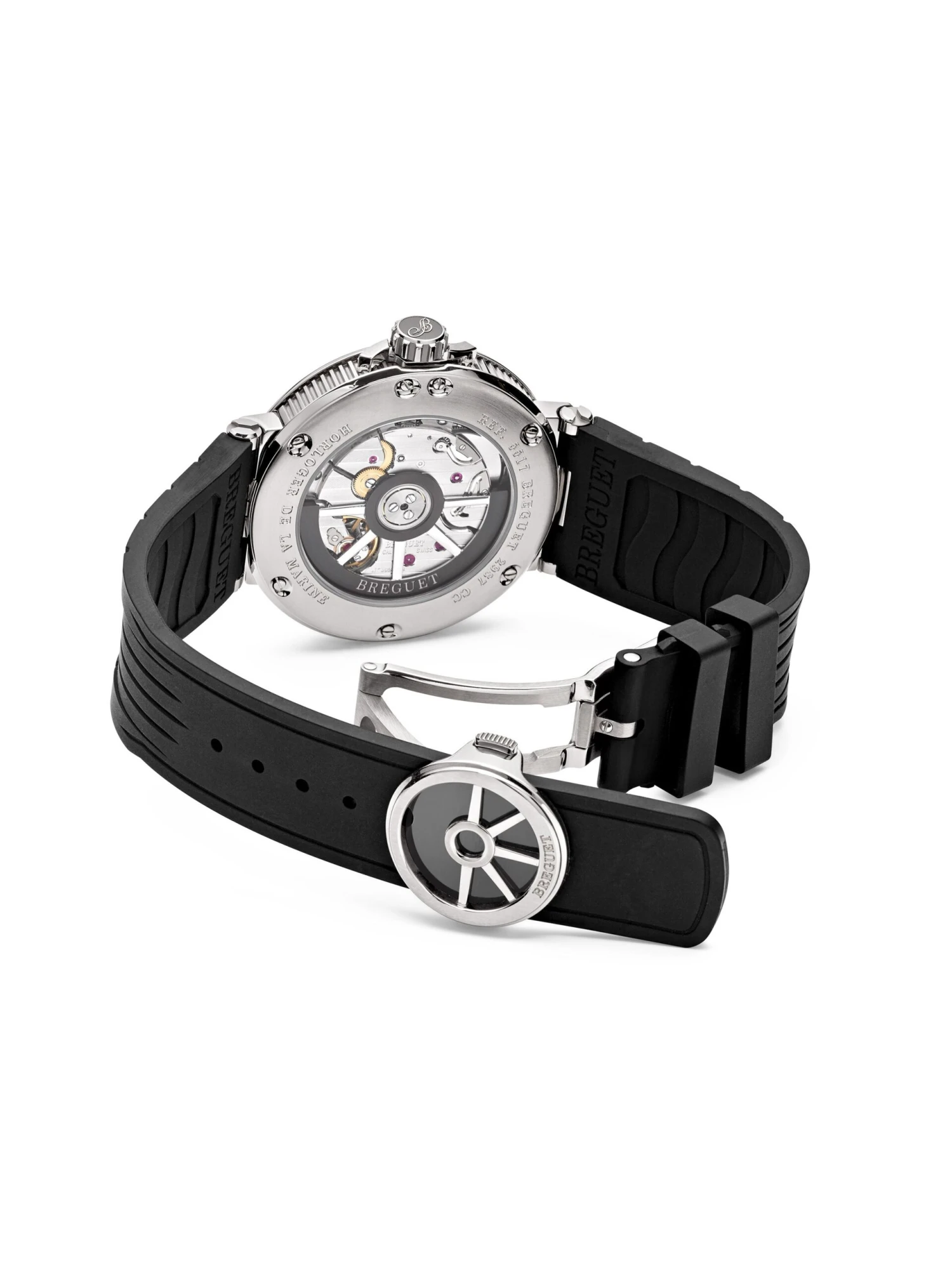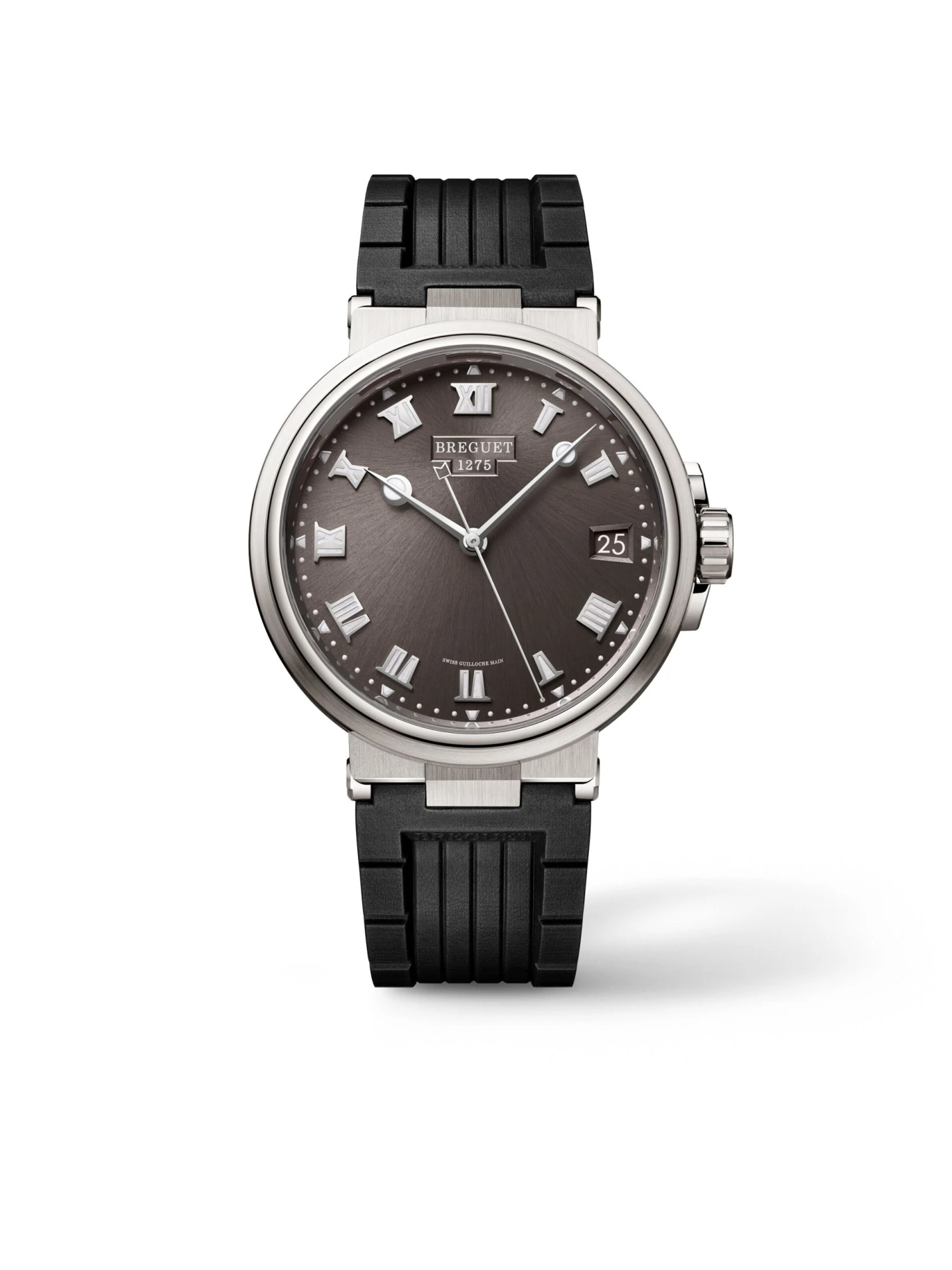 Breguet is continuing its maritime heritage in the Marine collection, giving it a new shape. The three-hand model 5517 displays the date at 3 o’clock. The 40 mm titanium gold case is combined with a highly resistant brown black rubber strap. Inside is the automatic manufacture caliber 777A with a power reserve of 55 hours. The highlight of this sporty timepiece is its anthracite dial with Roman indicators.