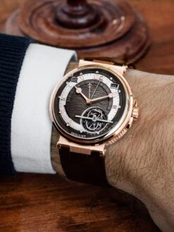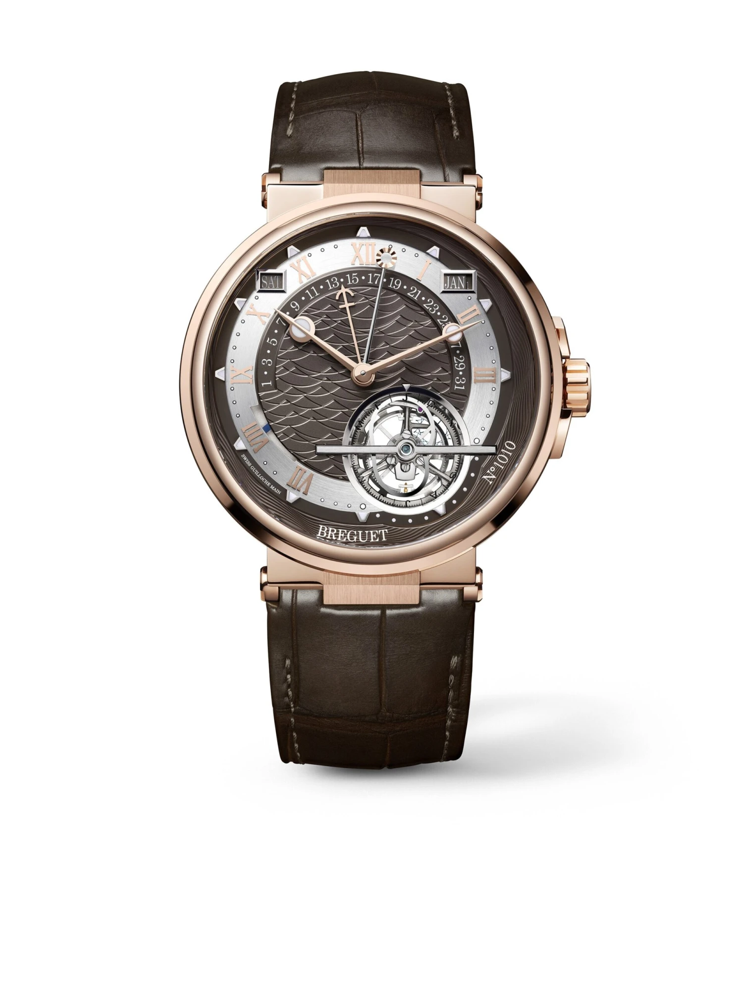 With a perpetual calendar, a minute tourbillon and an equation display (equation of time), the Marine Équation Marchante 5887BR/G2/9WV reflects the unique style of the house. The horological Ménage à Trois blends harmoniously and clearly into the elegant design of the brown, wave-decorated guilloche dial with noctilucent hands and markers. The caliber 581DPE with silicon escape wheel and silicon hairspring runs in an 18k rose gold case that is water-resistant to ten bar and measures 43.8 millimeters in size and 11.5 millimeters in height. The micromechanical cosmos consisting of 563 components offers a power reserve of 80 hours.