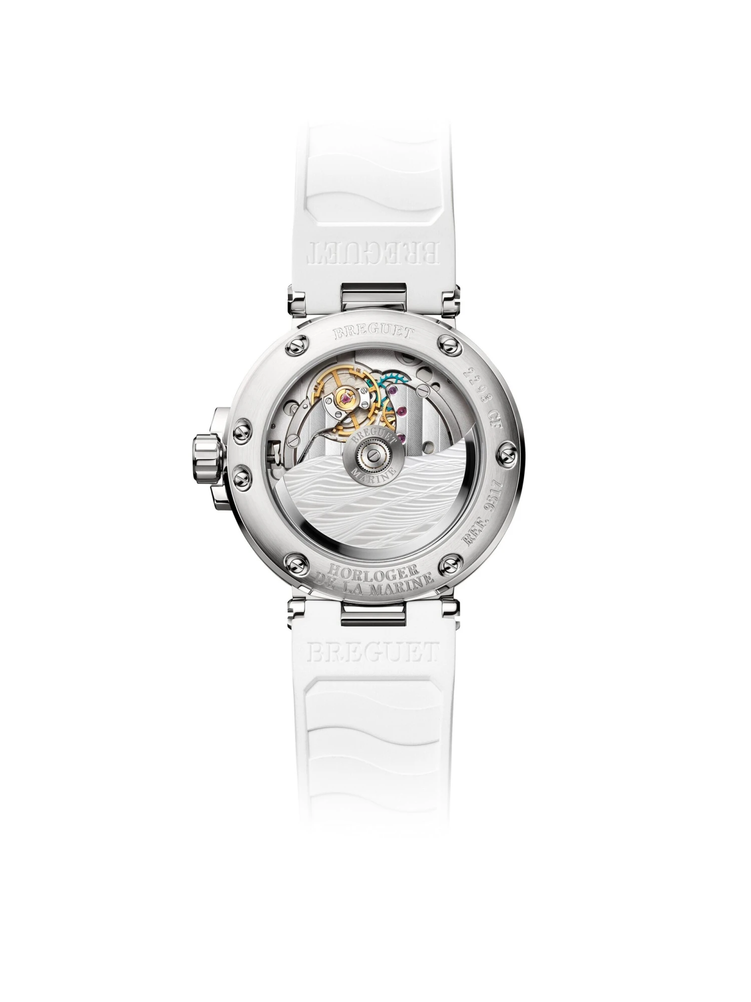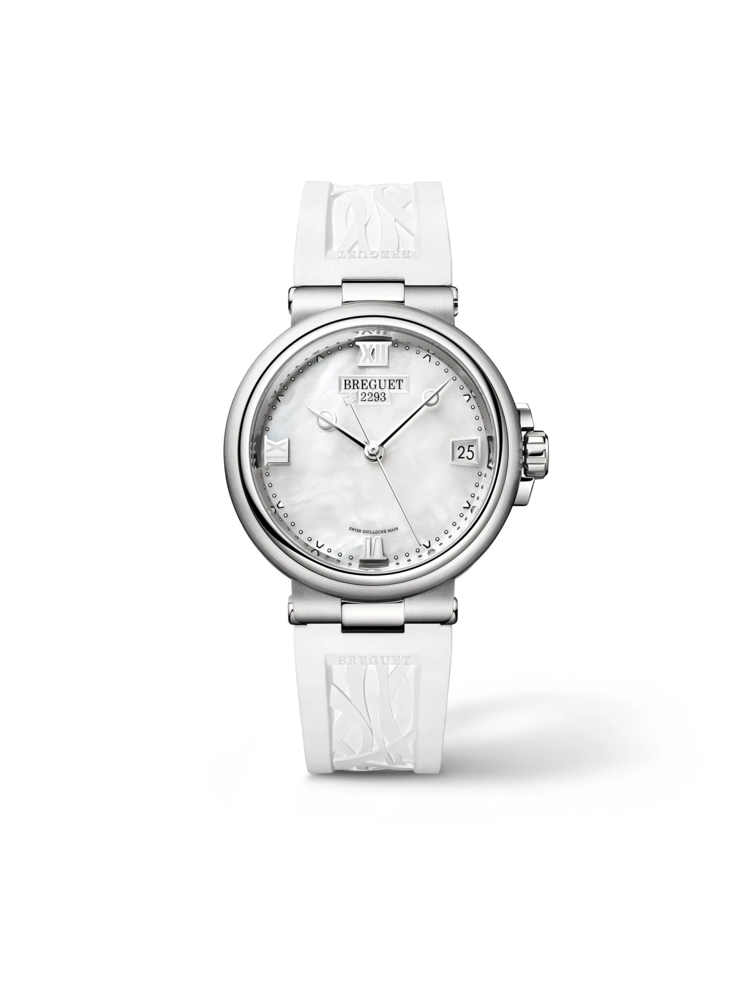 Understatement in its highest expression. Breguet’s Marine 9517 captivates by combining a bright, sporty rubber strap with a dial in natural mother-of-pearl. Water-resistant to a depth of 50 metres and the robust stainless steel case make the Marine 9517 the perfect ladies’ watch for everyday use as well as for evening events.