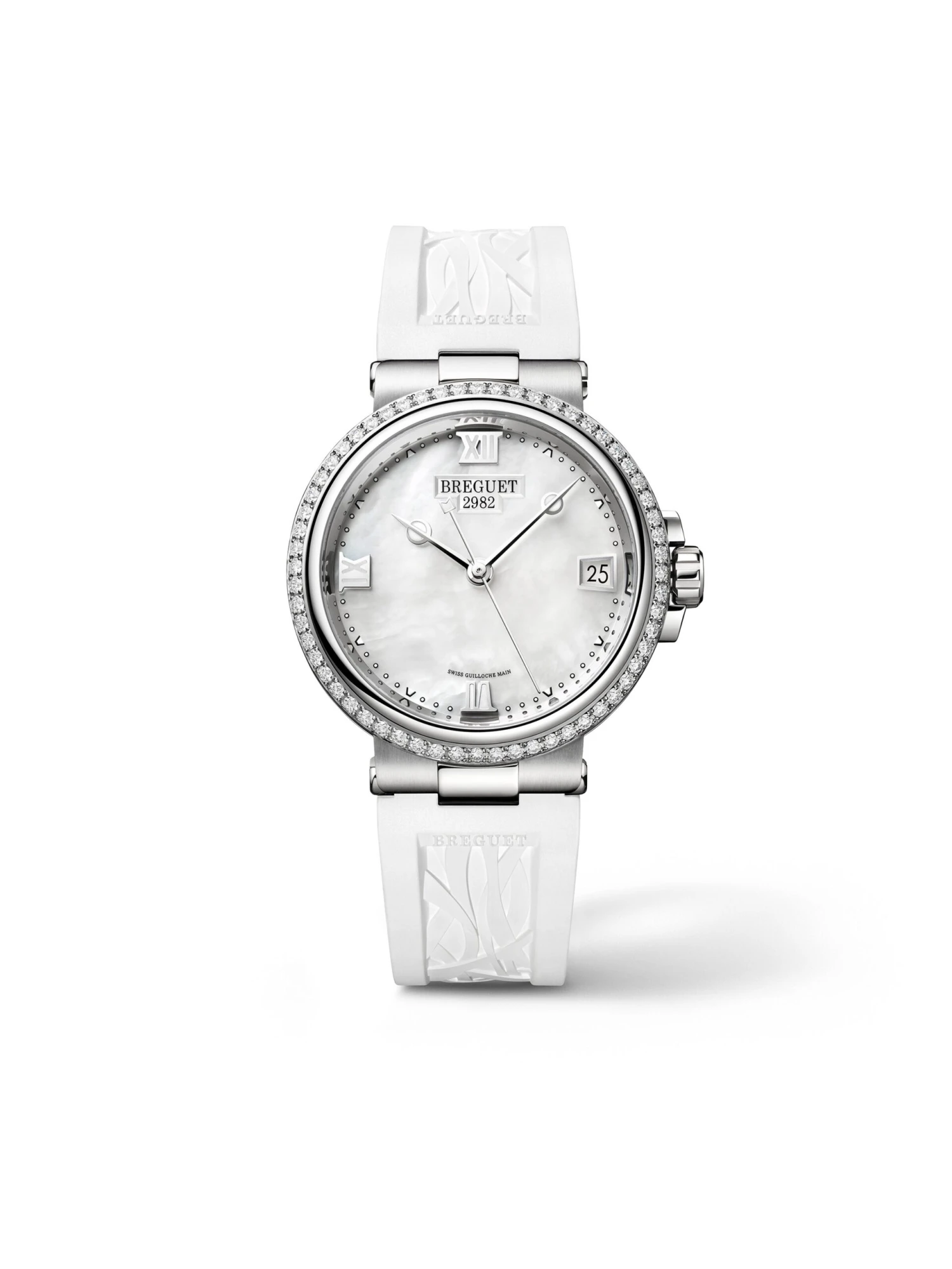 The Marine 9518 elegantly combines a high-quality rubber strap with a precious stainless steel case and a diamond-set bezel. 50 diamonds sparkle brilliantly with the white natural mother-of-pearl of the dial. An exquisite ladies’ watch that stylishly adorns the wrist of its wearer.