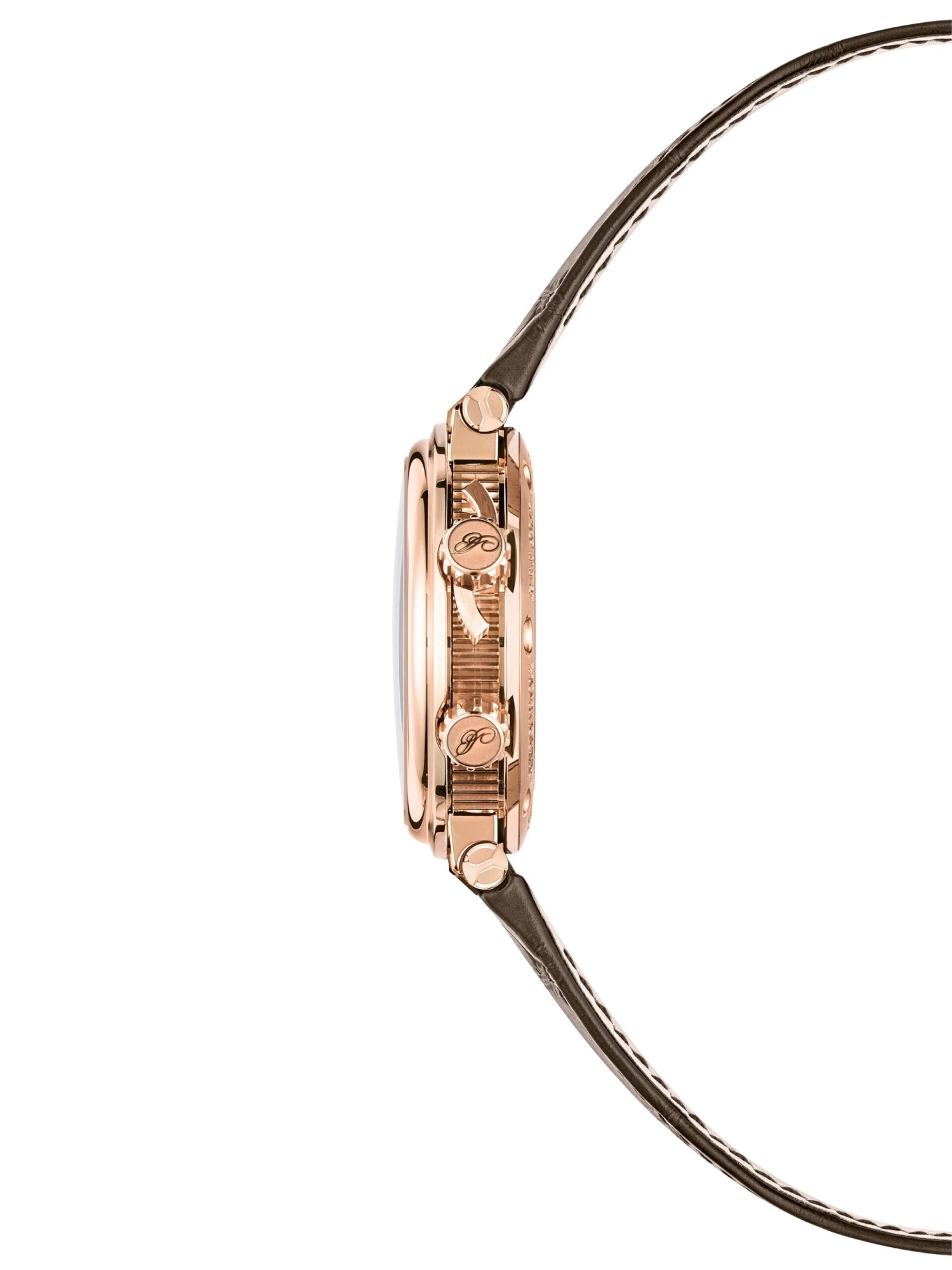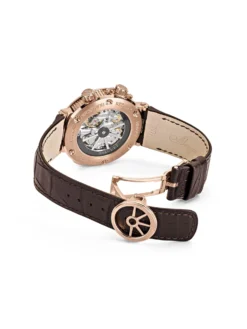 The Marine Alarme Musicale 5547BR/12/9ZU presents three popular complications on its dial guilloched with a distinctive wave pattern: a second time zone, a power reserve indicator and an alarm function. When the striking mechanism is triggered, a ship’s bell, tuned to the maritime theme, appears in the aperture at 12 o’clock. The center seconds hand also features a nautical design. In a rose gold case measuring 40 millimeters in diameter and 13.05 millimeters in height, caliber 519F/1 precisely sets the course.