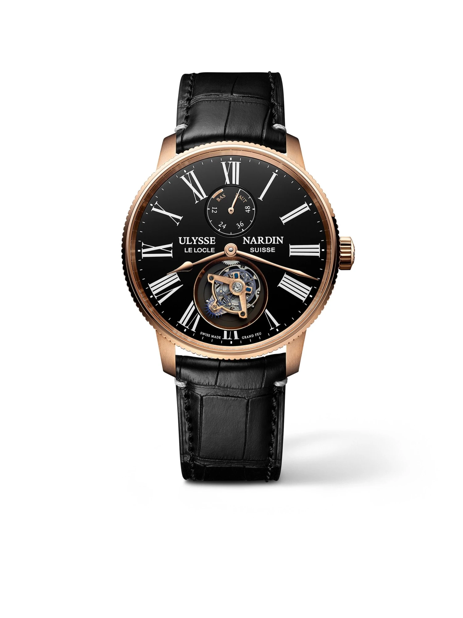 On the occassion of its 175 anniversary, Ulysse Nardin extends the Marine Torpilleur collection. The Marine Torbilleur Tourbillon Grand Feu is the crowning glory of these new, extraordinary timepieces. The 42-millimeter rose gold case with a knurled bezel encircles a black Grand Feu enamel dial and is completed by a black alligator-skin strap. Manufacture caliber UN-128, comprising 298 components and 36 rubies, drives the exclusive feature of this model: a flying tourbillon. The model comes in an edition limited to 175 models.
