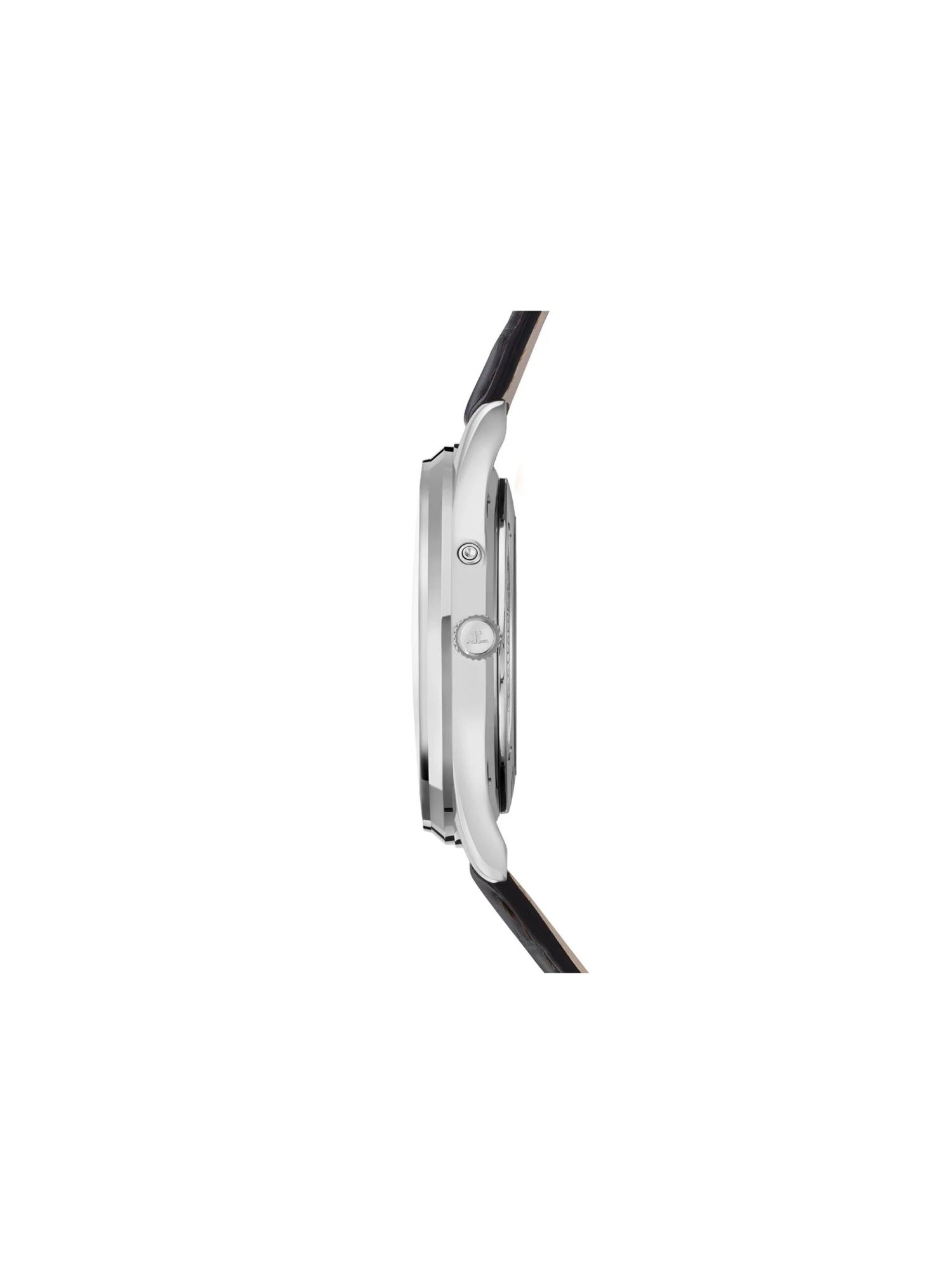 In addition to hour and minute hands, the Master Ultra Thin RĂ©serve de Marche’s silver-plated dial features a hand-type date display at two o’clock, a small seconds at six o’clock and a power reserve display between ten and eleven o’clock. The stainless steel case has a diameter of 39 millimeters at a height of 9.85 millimeters and features an automatic movement.
