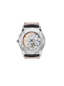In addition to hour and minute hands, the Master Ultra Thin Réserve de Marche’s silver-plated dial features a hand-type date display at two o’clock, a small seconds at six o’clock and a power reserve display between ten and eleven o’clock. The stainless steel case has a diameter of 39 millimeters at a height of 9.85 millimeters and features an automatic movement.
