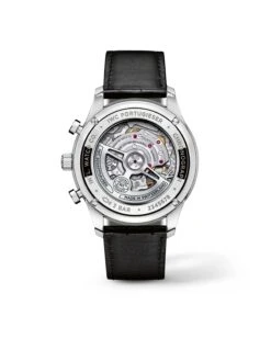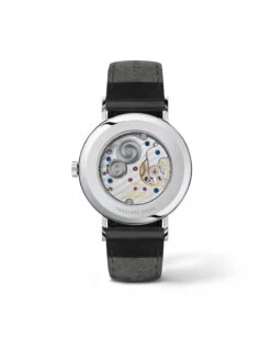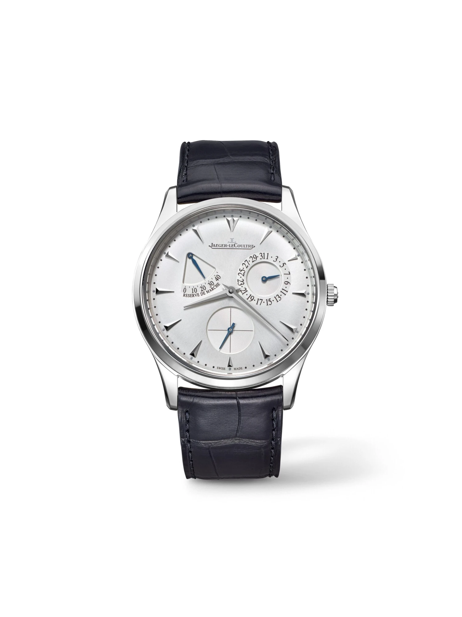 In addition to hour and minute hands, the Master Ultra Thin RĂ©serve de Marche’s silver-plated dial features a hand-type date display at two o’clock, a small seconds at six o’clock and a power reserve display between ten and eleven o’clock. The stainless steel case has a diameter of 39 millimeters at a height of 9.85 millimeters and features an automatic movement.