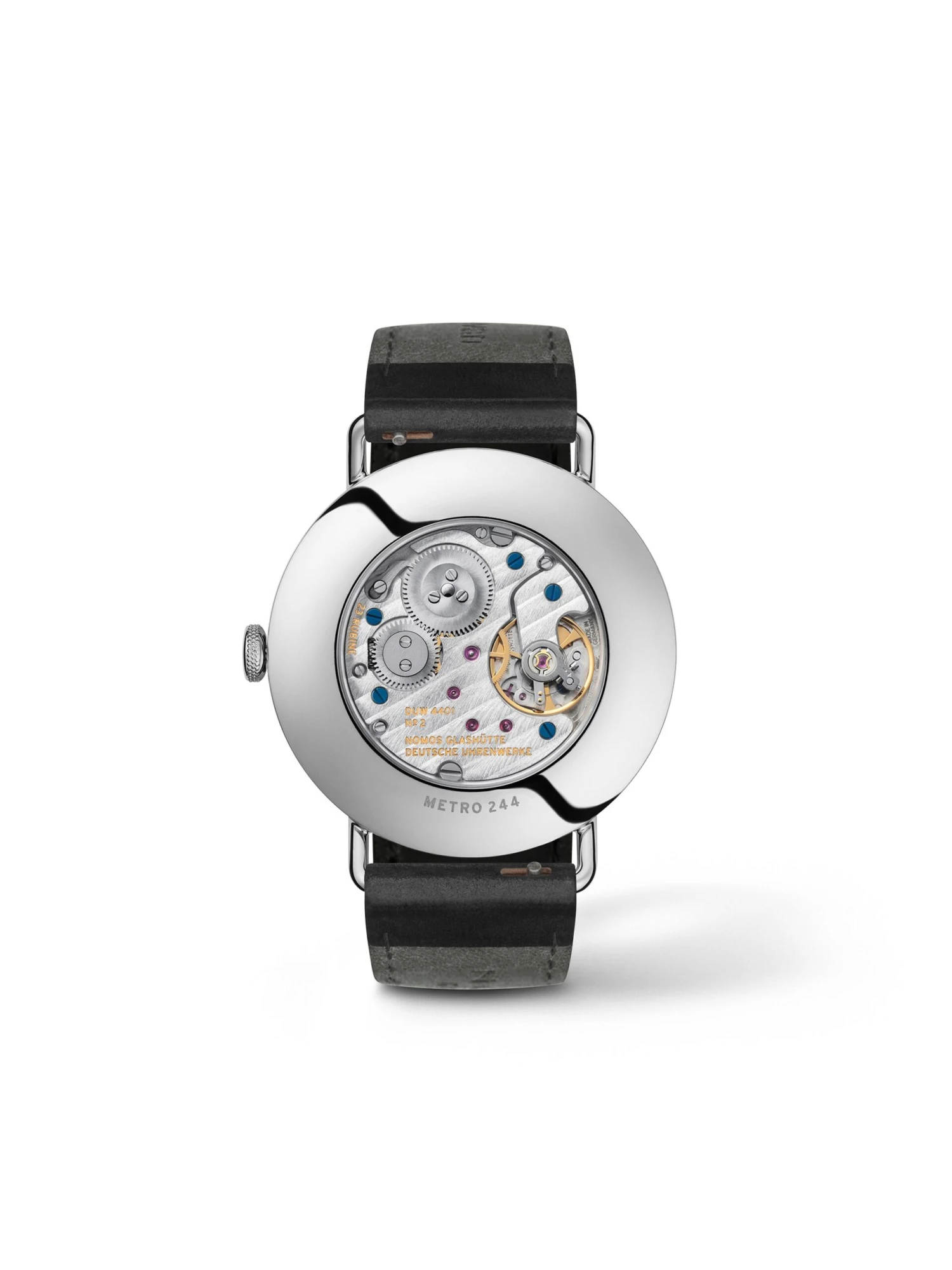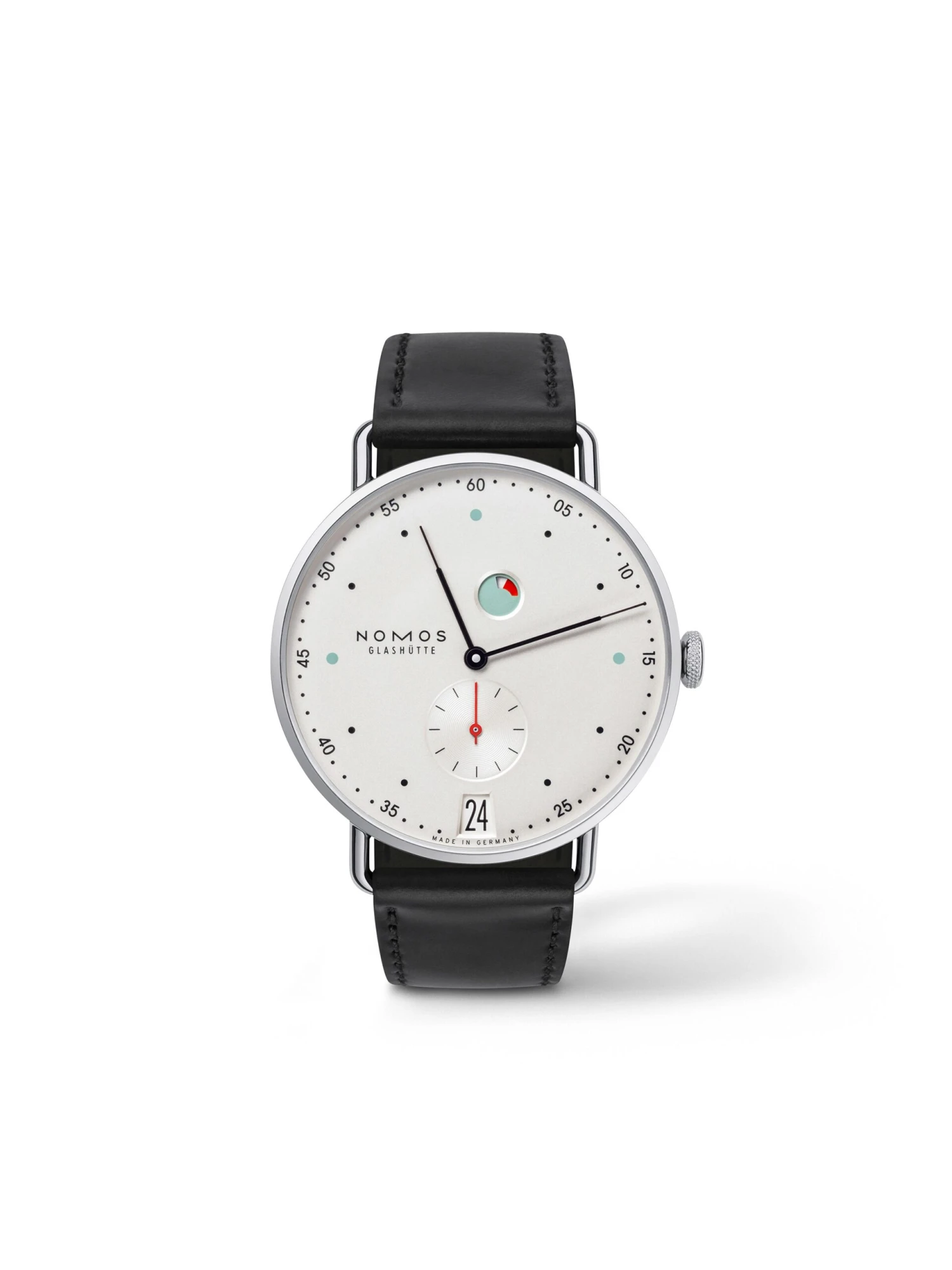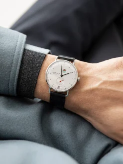 The Metro watch family, presented in 2014, has already won multiple awards for its harmonious design. It is the product of Berlin-based designer Mark Braun and combines precision with urban elegance. With intricate hands and pinpoint minute markings on the dial’s edge, the Metro 38, reference 1101, presents a particularly striking look. Its 37 x 7.8 millimeter stainless-steel case encloses the white, silver-plated dial, which rests atop a hand-wound Alpha caliber. The Metro 38, reference 1101, sits astride a Horween Genuine Shell Cordovan leather strap.