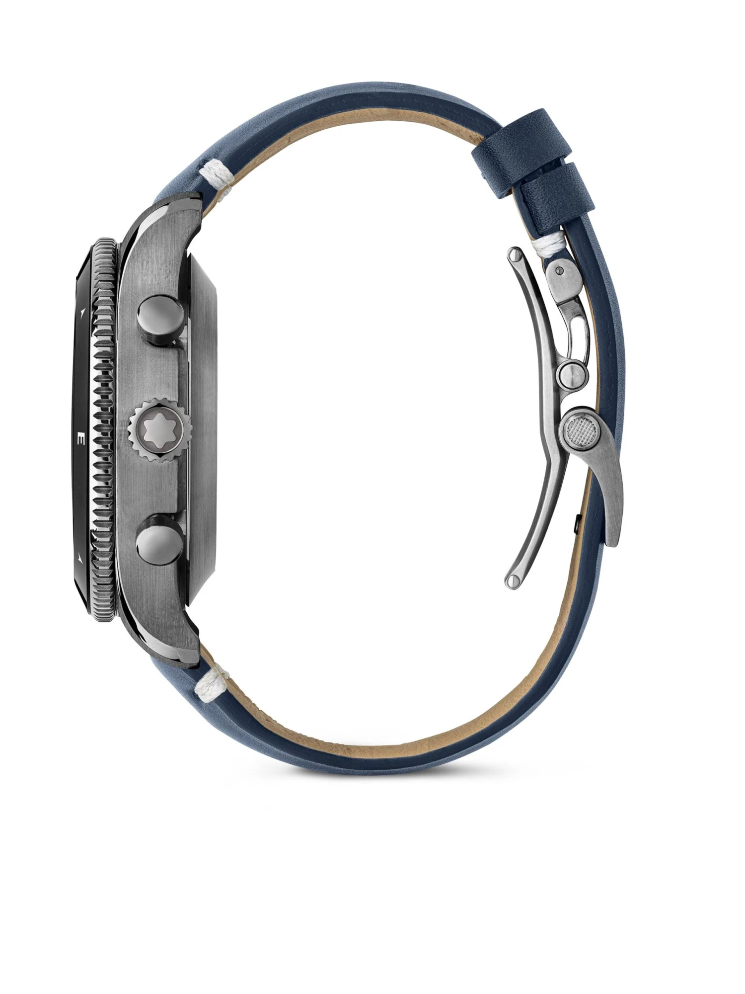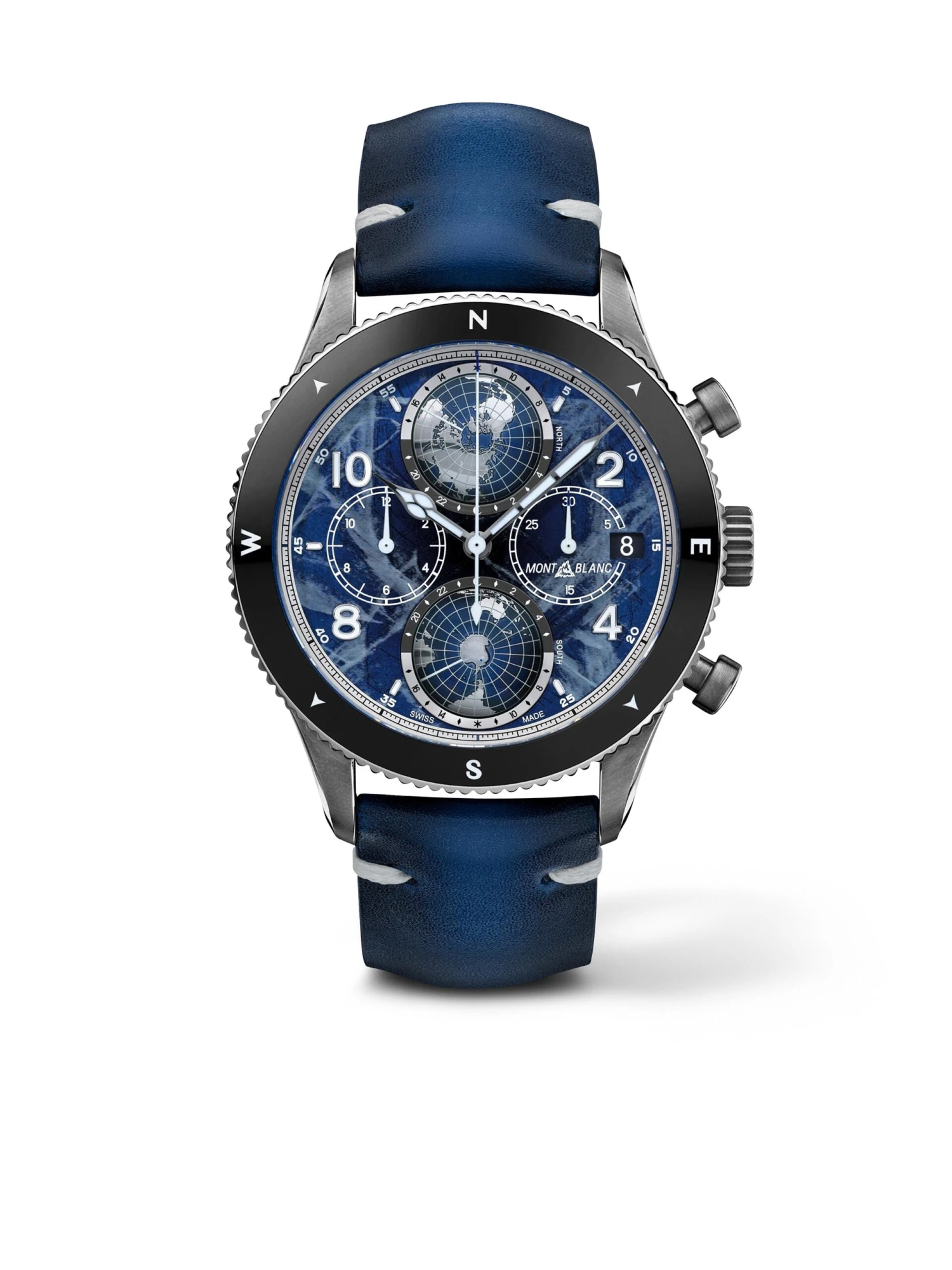 A chronograph now complements the 1858 line from Montblanc. Designed for the next Mount Everest expedition of Nepalese mountaineer Nimsdai Purja, the new chronograph movement MB 29.27 of the 1858 Geosphere Chronograph 0 Oxygen Ref. 129624 from Montblanc manages without any oxygen. The timepiece’s 44-millimeter case, which is water-resistant to 30 bar, is made of very light and robust titanium, making it perfect for mountain tours. The bidirectional rotating black ceramic bezel also features the cardinal directions for good orientation in the terrain. The eye-catching feature is the glacier-blue dial, which appears as if it has been frozen over with a layer of ice thanks to the rediscovered gratté boisé technique. The impressive mountaineering watch is fitted on an easy-to-change blue calfskin strap and is limited to only 290 pieces worldwide.