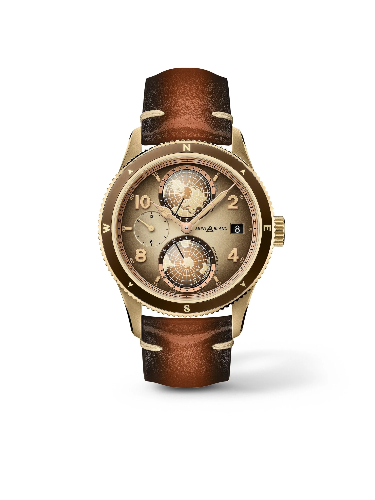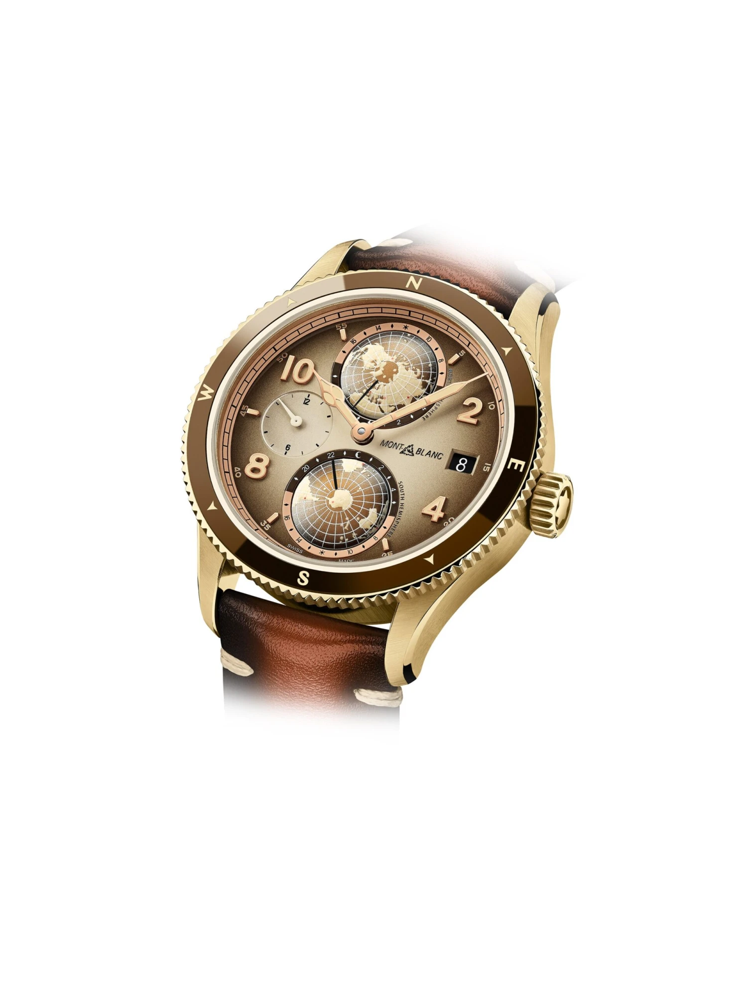 Inspired by the colors of the desert, the 1858 Geosphere Limited Edition 1858 from Montblanc presents itself in shades of brown. The 42-millimeter case in brushed bronze, the smoky-brown and beige lacquered dial with rose gold-plated hands and applied hour markers, and the matching vintage brown calfskin strap create the striking design of this sturdy timepiece, which is driven by manufacture caliber MB 29.25 with world-time complication. Limited to 1858 watches worldwide.Â