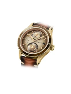 Inspired by the colors of the desert, the 1858 Geosphere Limited Edition 1858 from Montblanc presents itself in shades of brown. The 42-millimeter case in brushed bronze, the smoky-brown and beige lacquered dial with rose gold-plated hands and applied hour markers, and the matching vintage brown calfskin strap create the striking design of this sturdy timepiece, which is driven by manufacture caliber MB 29.25 with world-time complication. Limited to 1858 watches worldwide.