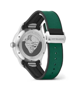 A diving watch inspired by the glacial lakes of the Mont Blanc massif. The 1858 Iced Sea Automatic Date (Ref. 131450) impresses with a “frozen” dial, for which Montblanc has rediscovered the gratté boisé technique. The dial with a date display at 3 o’clock and the unidirectional rotating ceramic bezel are green. The back of the 41-millimeter stainless steel case features an elaborate relief engraving of an iceberg and a diver, and inside ticks self-winding caliber MB 24.17, which makes this impressive sports watch a certified diving timepiece according to the ISO 6425 standard. Water-resistant to 300 meters, the watch is fitted on an interchangeable green rubber strap.