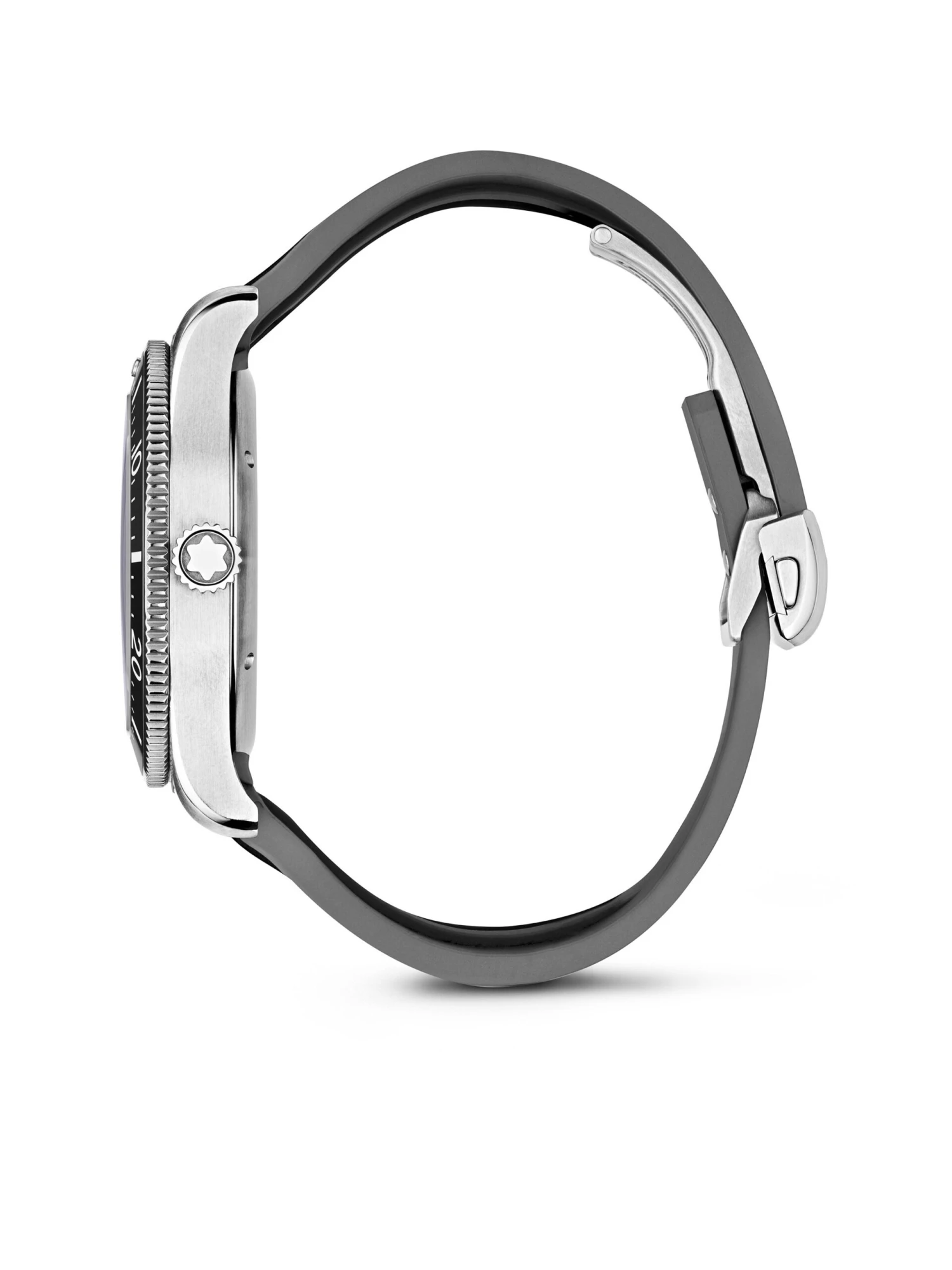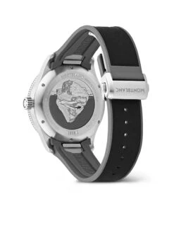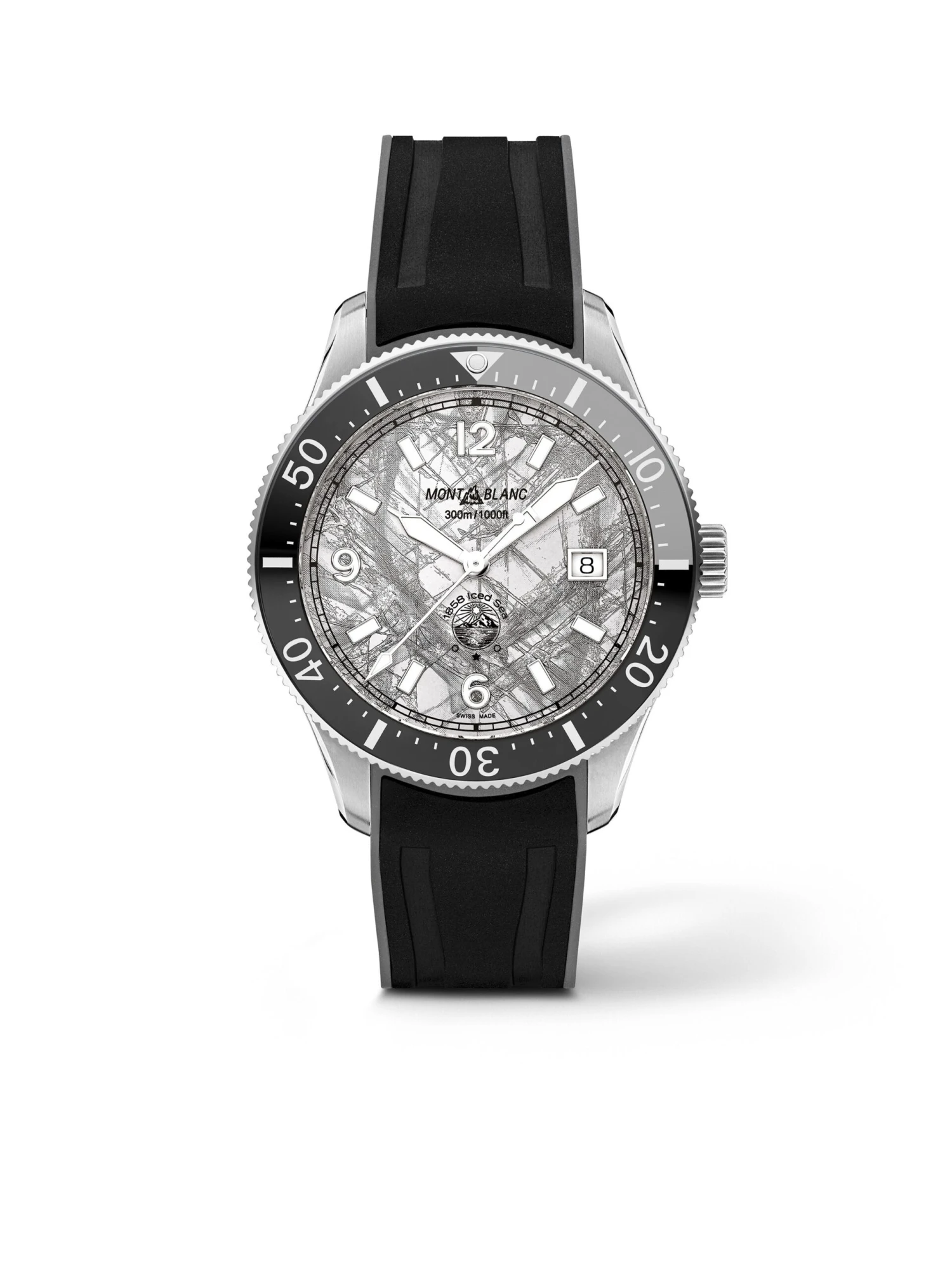 A diving watch inspired by the glacial lakes of the Mont Blanc massif. The 1858 Iced Sea Automatic Date (Ref. 130807) impresses with a “frozen” dial, for which Montblanc has rediscovered the gratté boisé technique. The dial with a date display at 3 o’clock and the unidirectional rotating ceramic bezel are gray. The back of the 41-millimeter stainless steel case features an elaborate relief engraving of an iceberg and a diver, and inside ticks self-winding caliber MB 24.17, which makes this impressive sports watch a certified diving timepiece according to the ISO 6425 standard. Water-resistant to 300 meters, the watch is fitted on an interchangeable black rubber strap.