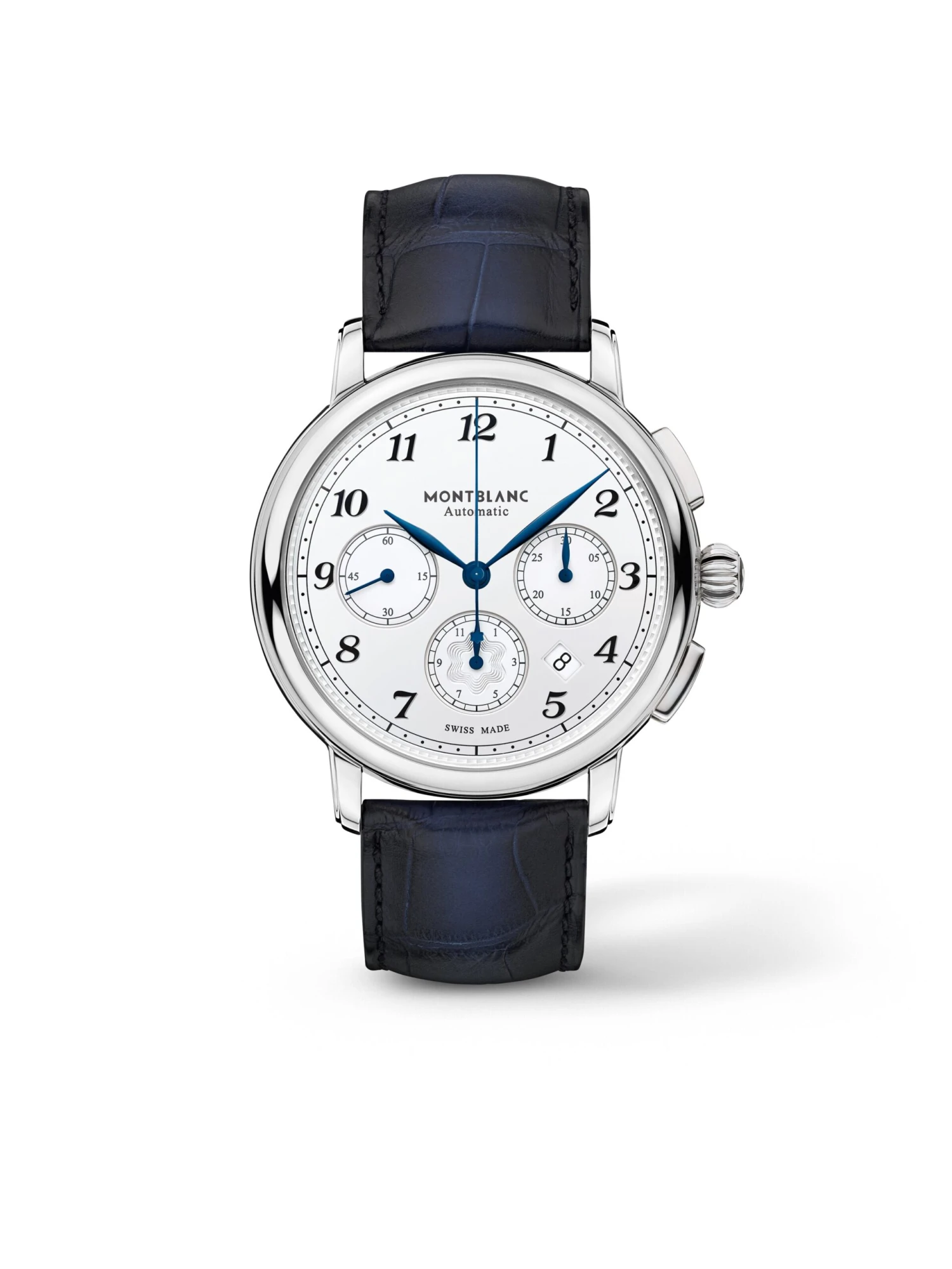 Minerva’s historical legacy inspired the design and technology of the Star Legacy Automatic Chronograph Ref. 118514. The MB 25.02 automatic caliber with 12-hour and 30-minute counters and central stop-second ticks in an elegant stainless steel case measuring 42.0 x 14.23 millimeters. The color scheme of the guilloched dial with newly designed black Arabic numerals and classically blued leaf hands is also elegant. The black railroad minute hand also stands out expressively against the silver-white background. The timepiece sits on a new strap made of blue sfumato alligator-skin from the Montblanc Pelletteria in Florence.